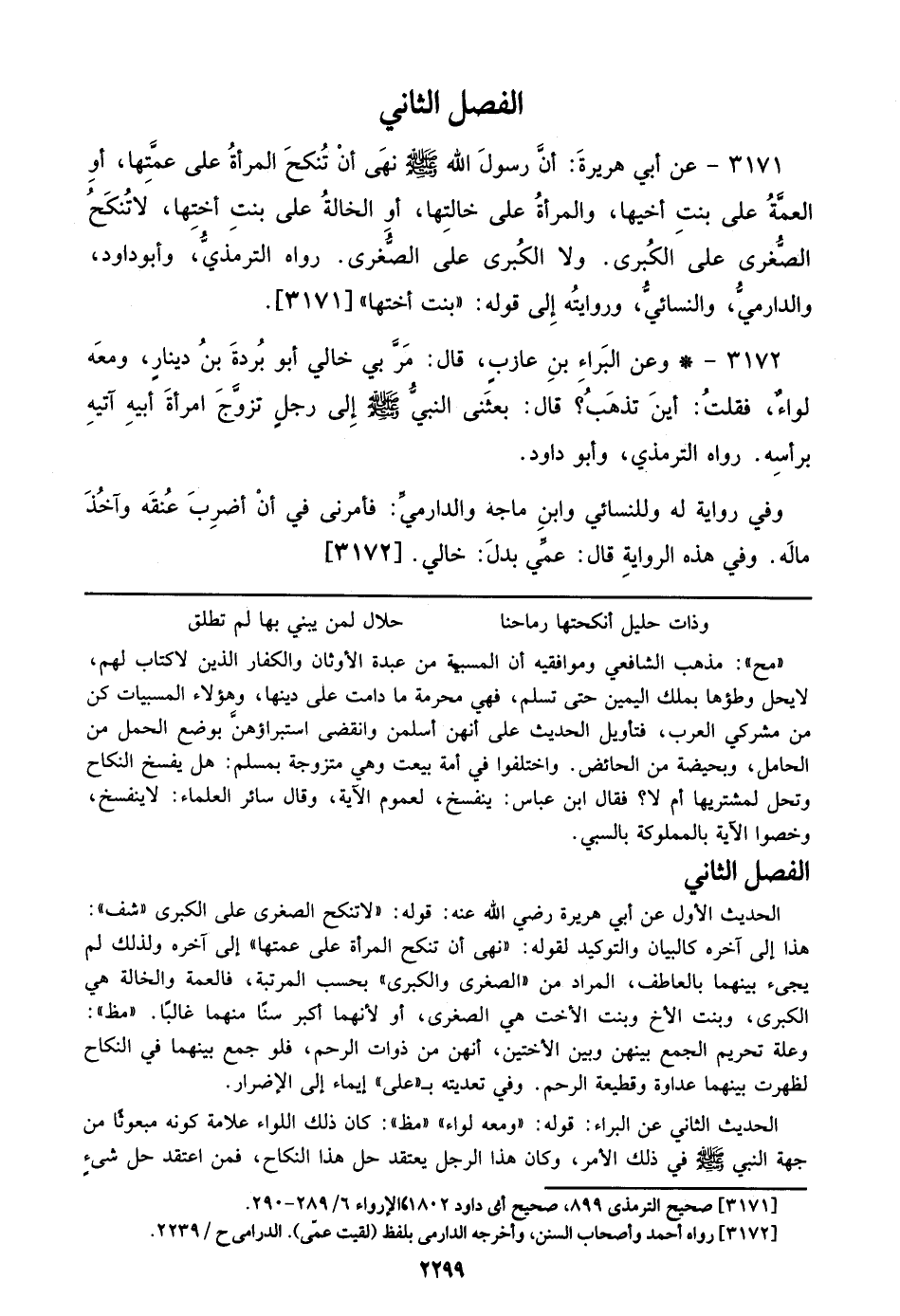 3171 – عن أبي هريرة: أن رسول الله صلى الله عليه وسلم نهي أن تنكح المرأة علي عمتها، أو العمة علي بنت أخيها، والمرأة علي خالتها، أو الخالة علي بنت أختها، لا تنكح الصغرى علي الكبرى. ولا الكبرى علي الصغرى. رواه الترمذي، وأبو داود، والدارمي، والنسائي، وروايته إلي قوله: ((بنت أختها)) [3171]