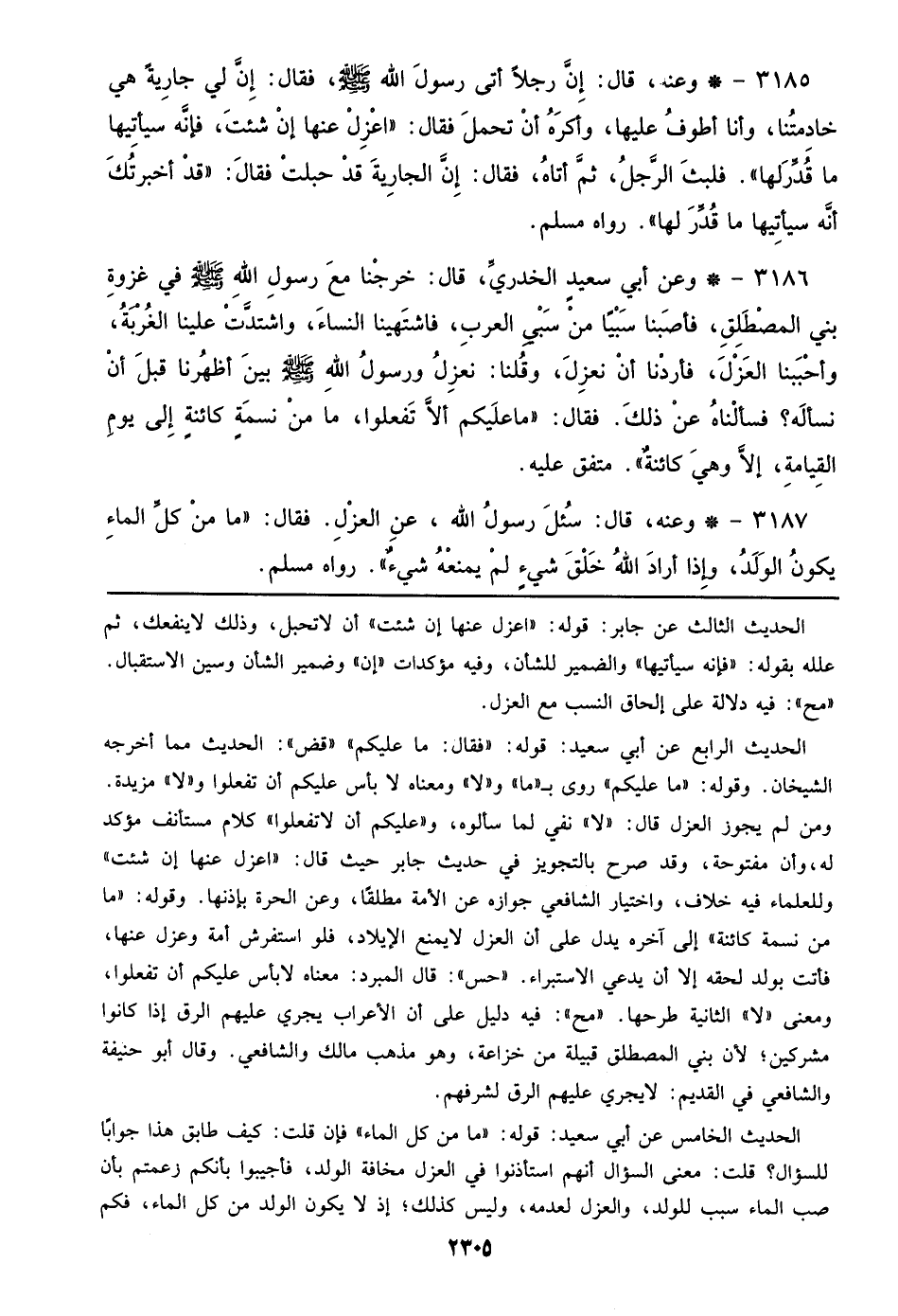 3186 - وعن أبي سعيد الخدري، قال: خرجنا مع رسول الله صلى الله عليه وسلم في غزوة بني المصطلق، فأصبنا سبيا من سبي العرب، فاشتهينا النساء، واشتدت علينا الغربة، وأحببنا العزل، فأردنا أن نعزل، وقلنا: نعزل ورسول الله صلى الله عليه وسلم بين أظهرنا قبل أن نسأله؟ فسألناه عن ذلك. فقال: ((ما عليكم ألا تفعلوا، ما من نسمة كائنة إلي يوم القيامة، إلا وهي كائنة)). متفق عليه.