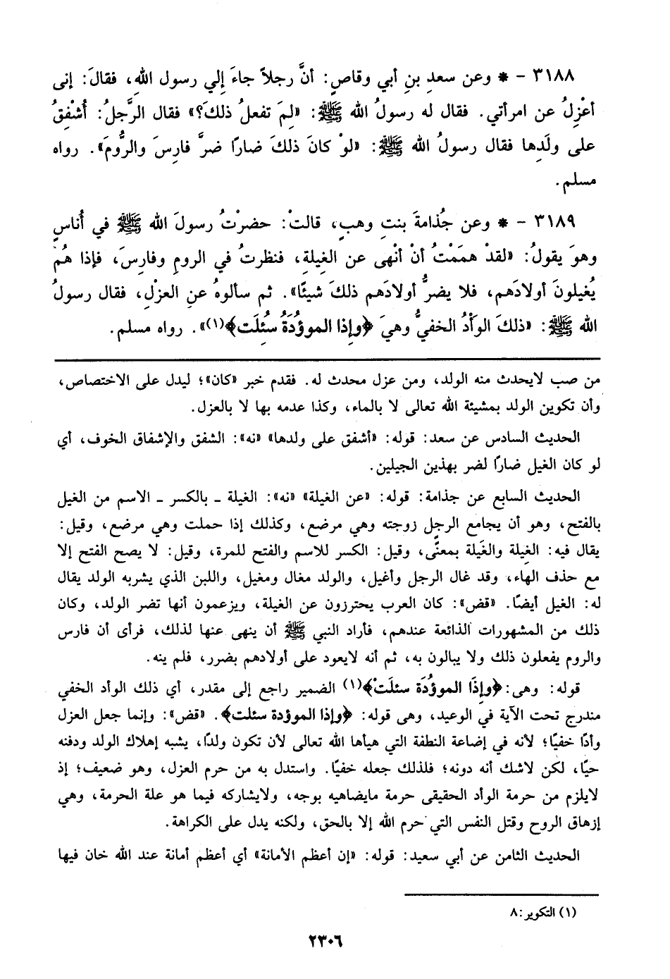 3188 - وعن سعد بن أبي وقاص: أن رجلا جاء إلي رسول الله، فقال: إني أعزل عن امرأتي. فقال له رسول الله صلى الله عليه وسلم: ((لم تفعل ذلك؟)) فقال الرجل: أشفق علي ولدها فقال رسول الله صلى الله عليه وسلم: ((لو كان ذلك ضارا ضر فارس والروم)). رواه مسلم.