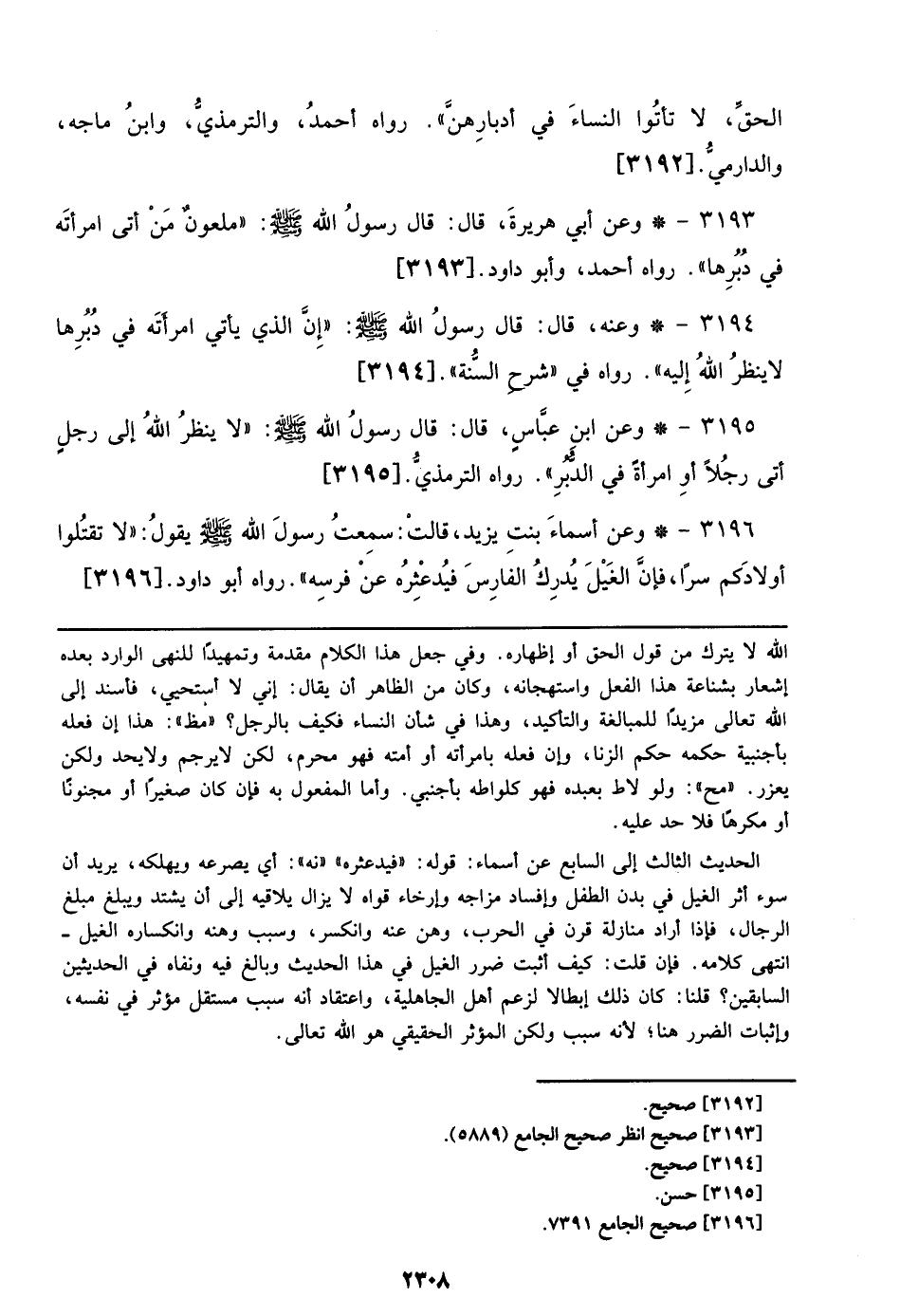 3195 - وعن ابن عباس، قال: قال رسول الله صلى الله عليه وسلم: ((لا ينظر الله إلي رجل أتى رجلا أو امرأة في الدبر)). رواه الترمذي. [3195]
