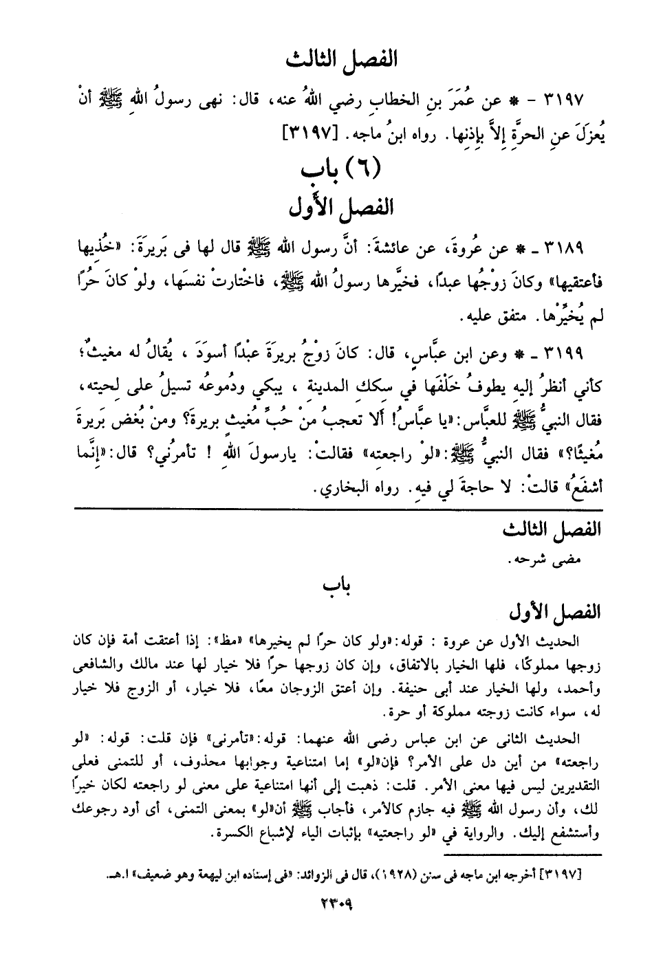 3199 - وعن ابن عباس، قال: كان زوج بريرة عبدا أسود، يقال له مغيث؛ كإني أنظر إليه يطوف خلفها في سكك المدينة، يبكي ودموعه تسيل علي لحيته، فقال النبي صلى الله عليه وسلم للعباس: ((يا عباس! ألا تعجب من حب مغيث بريرة؟ ومن بغض بريرة مغيثا؟)) فقال النبي صلى الله عليه وسلم: ((لو راجعته)) فقالت: يا رسول الله! تأمرني؟ قال: ((إنما أشفع)) قالت: لا حاجة في فيه. رواه البخاري.