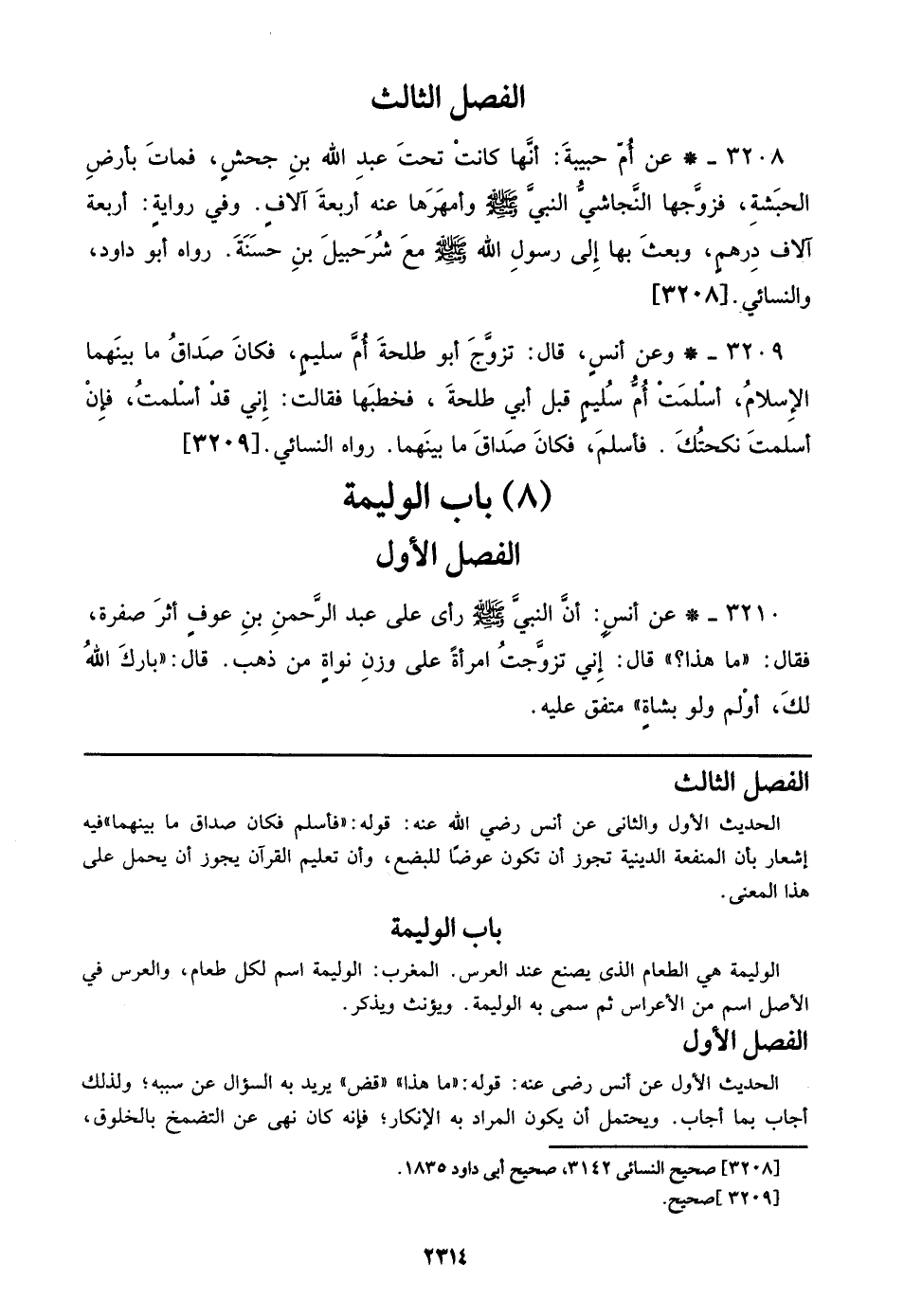 3210 - عن أنس: أن النبي صلى الله عليه وسلم رأي علي عبد الرحمن بن عوف أثر صفرة، فقال: ((ما هذا؟)) قال: إني تزوجت امرأة علي وزن نواة من ذهب. قال: ((بارك الله لك، أولم ولو بشاة)) متفق عليه.