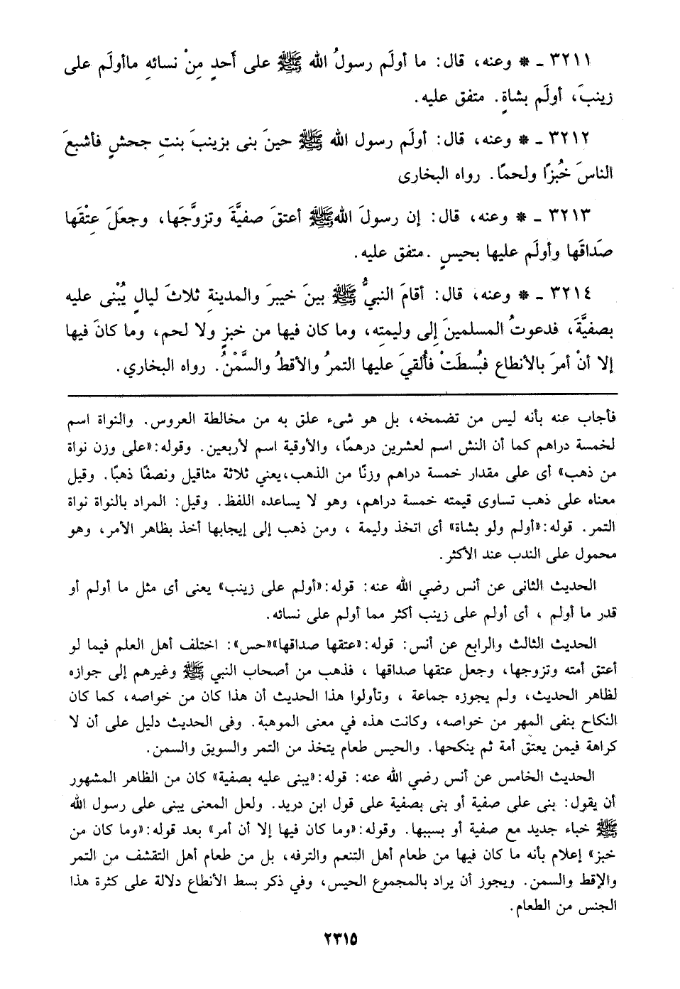 3213 - وعنه، قال: إن رسول الله صلى الله عليه وسلم أعتق صفية وتزوجها، وجعل عتقها صداقها وأولم عليها بحيس. متفق عليه.