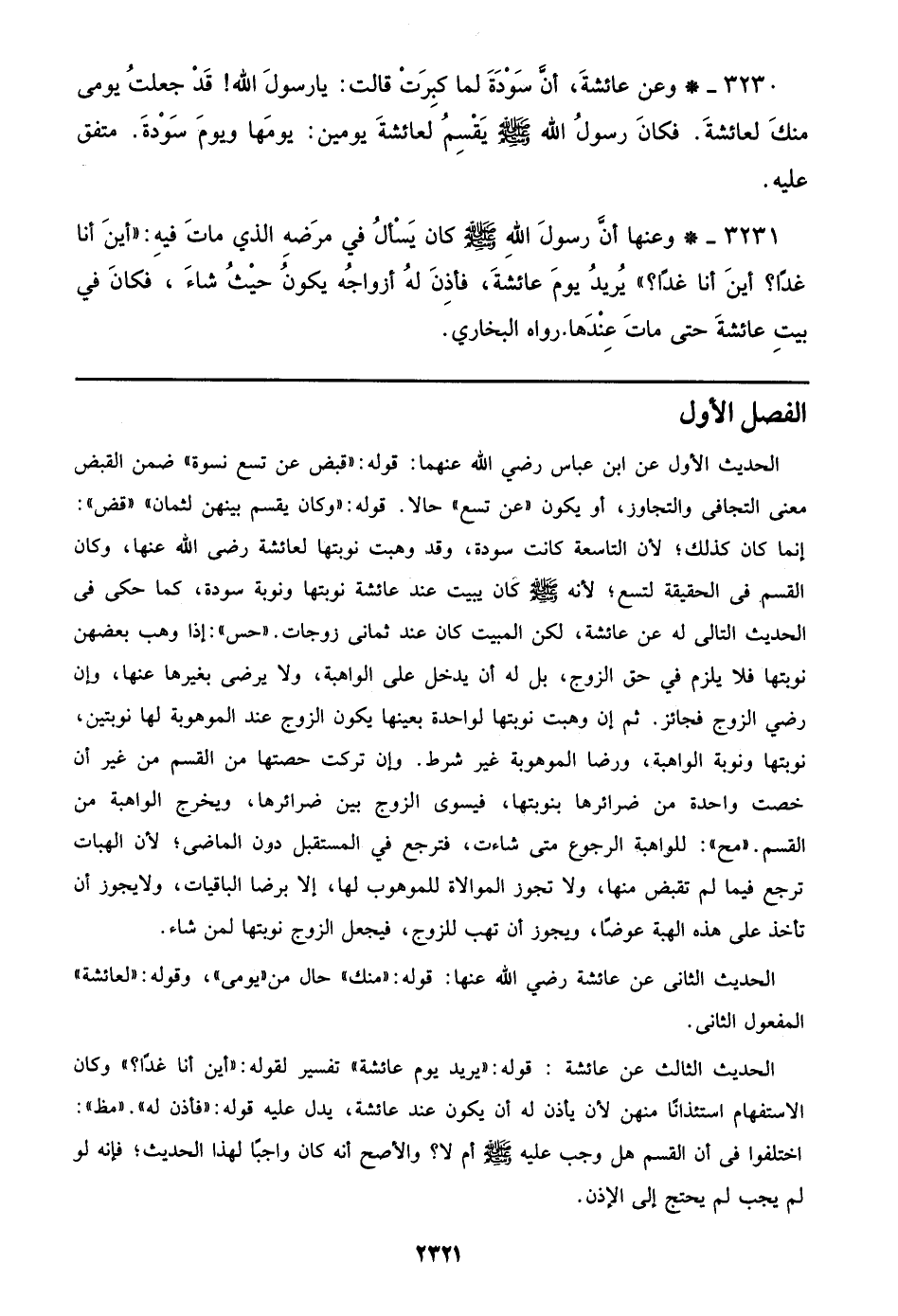 3230 - وعن عائشة، أن سودة لما كبرت قالت: يا رسول الله! قد جعلت يومي منك لعائشة. فكان رسول الله صلى الله عليه وسلم يقسم لعائشة يومين: يومها ويوم سودة. متفق عليه.