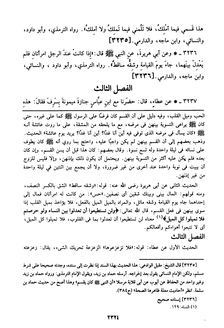 الحديث الثاني عن أبي هريرة رضي الله عنه: قوله: ((وشقه ساقط)) الشق بالكسر النصف، ومنه قولهم: المال بيني وبينك شقني أي نصفين. ((حس)): من كانت له امرأتان فمال إلي إحداهما جاء يوم القيامة وشقه مائل، والمراد بالميل الميل بالفعل، فلا يؤاخذ بميل القلب إذا سوى بينهن في فعل القسم، قال الله تعالي: {ولَن تَسْتَطِيعُوا أَن تَعْدِلُوا بَيْنَ النِّسَاءِ ولَوْ حَرَصْتُمْ فَلا تَمِيلُوا كُلَّ المَيْلِ} معناه لن تستطيعوا أن تعدلوا بما في القلوب، فلا تميلوا كل الميل، أي لا تتبعوا أهواءكم وأفعالكم.