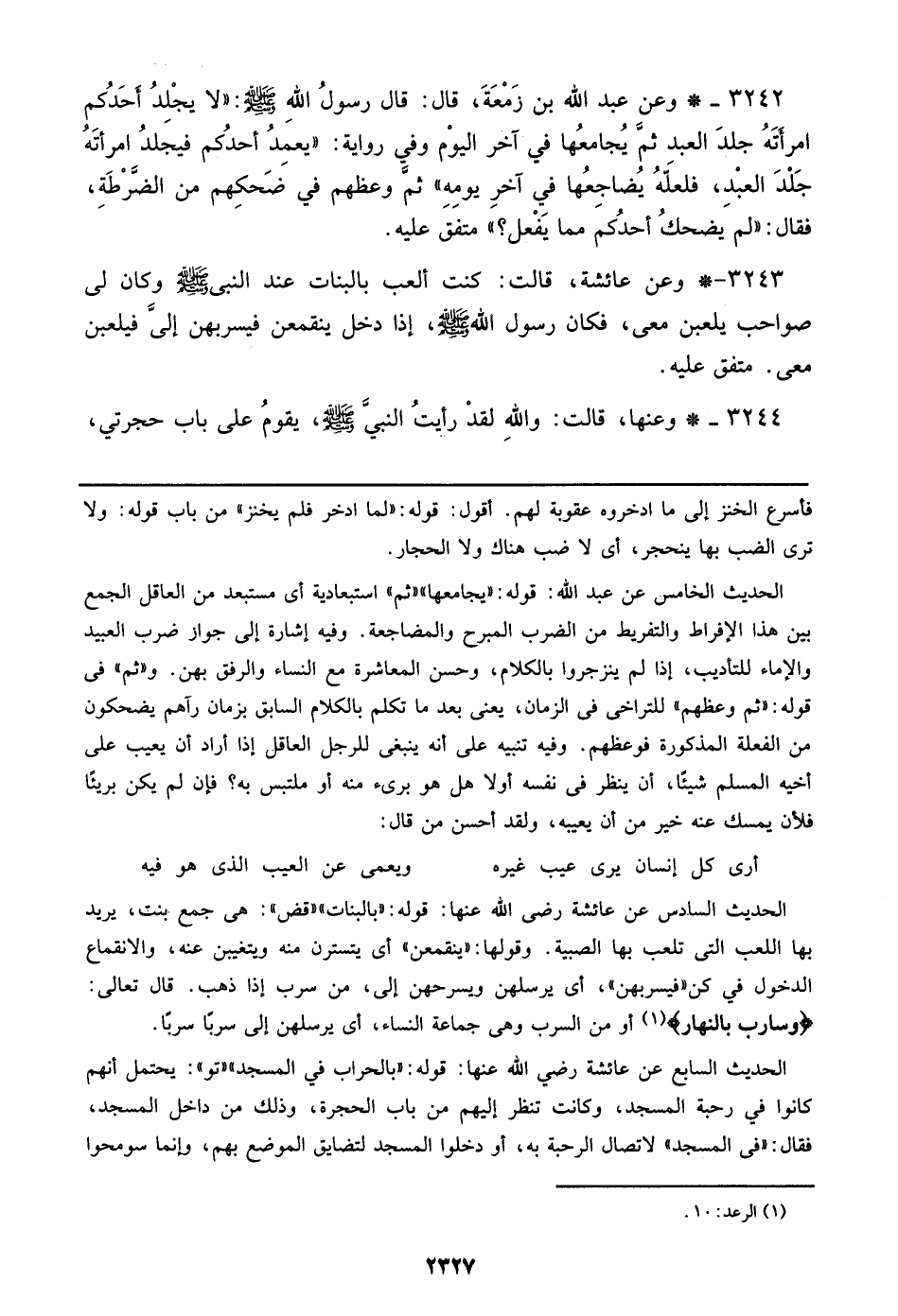 3242 - وعن عبد الله بن زمعة، قال: قال رسول الله صلى الله عليه وسلم: ((لا يجلد أحدكم امرأته جلد العبد ثم يجامعها في آخر اليوم وفي رواية: ((يعمد أحدكم فيجلد امرأته جلد العبد، فلعله يضاجعها في آخر يومه)) ثم وعظهم في ضحكهم من الضرطة، فقال: ((لم يضحك أحدكم مما يفعل؟)) متفق عليه.