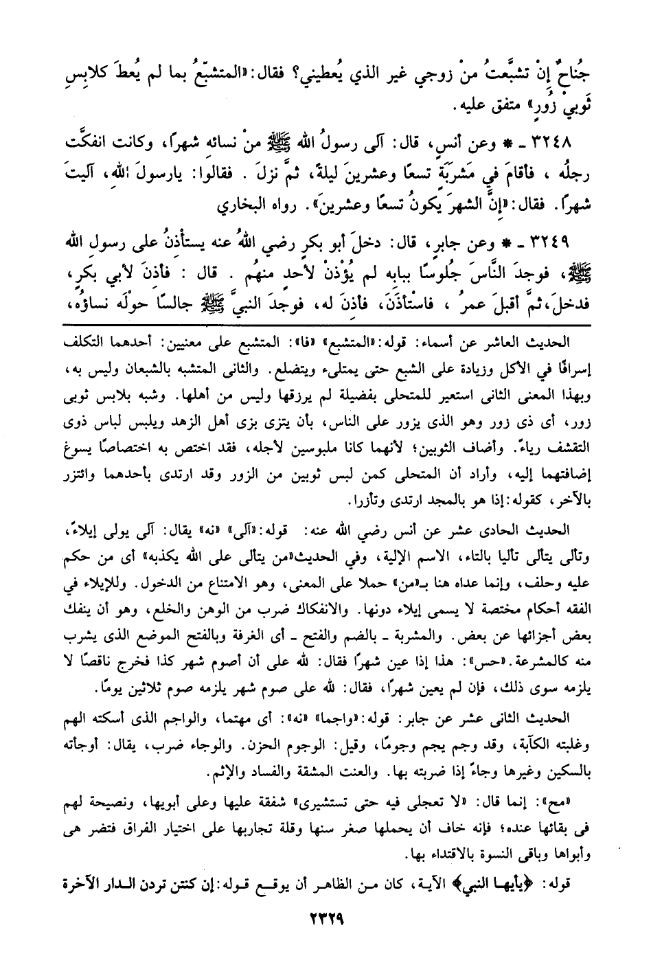 3248 - وعن أنس، قال: آلي رسول الله صلى الله عليه وسلم من نسائه شهراً، وكانت انفكت رجله، فأقام في مشربة تسعاً وعشرين ليلة، ثم نزل. فقالوا: يا رسول الله، آليت شهراً. فقال: ((إن الشهر يكون تسعاً وعشرين)). رواه البخاري.