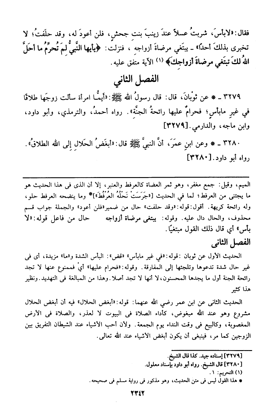 الحديث الأول عن ثوبان: قوله: ((في غير ما بأس)) ((قض)): البأس الشدة و ((ما)) مزيدة، أي في غير حال شدة تدعوها وتلجئها إلي المفارقة. وقوله: ((فحرام عليها)) أي فممنوع عنها لا تجد رائحة الجنة أول ما يجدها المحسنون، لا أنها لا تجد أصلا. وهذا من المبالغة في التهديد. ونظير هذا كثير.