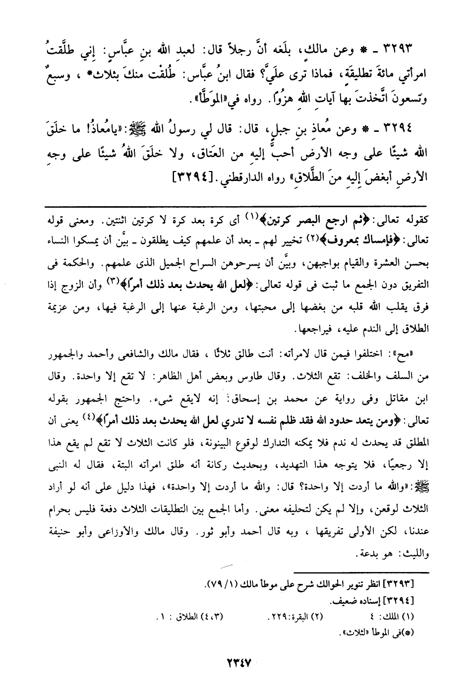 3294 - وعن معاذ بن جبل، قال: قال لي رسول الله صلى الله عليه وسلم: ((يا معاذ! ما خلق الله شيئاً علي وجه الأرض أحب إليه من العتاق، ولا خلق الله شيئاً علي وجه الأرض أبغض إليه من الطلاق)) رواه الدارقطني. [3294]