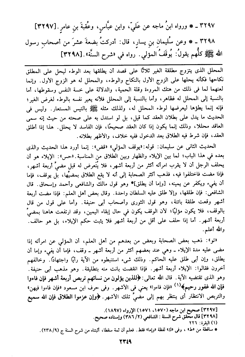((تو)): ذهب بعض الصحابة وبعض من بعدهم من أهل العلم، أن المؤلي عن امرأته إذا مضى عليه مدة الإيلاء – وهي عند بعضهم أكثر من أربعة أشهر – وقف، فإما أن يفيء وإما أن يطلق، وإن أبي طلق عليه الحاكم. وذلك شيء استنبطوه من الآية رأياً واجتهاداً. وخالفهم آخرون فقالوا: الإيلاء أربعة أشهر. فإذا انقضت بانت منه بتطليقة. وهو مذهب أبي حنيفة. وهو الذي تقتضيه الآية. قال الله تعالي: {لِلَّذِينَ يُؤْلُونَ مِن نِّسَائِهِمْ تَرَبُّصُ أَرْبَعَةِ أَشْهُرٍ فَإن فَاءُوا فَإنَّ اللَّهَ غَفُورٌ رَّحِيمٌ} ((فإن فاءوا)) يعني في الأشهر. وفي حرف ابن مسعود ((فإن فاءوا فيهن)) والتربص الانتظار أي ينتظر بهم إلي مضي تلك الأشهر. {وإنْ عَزَمُوا الطَّلاقَ فَإنَّ اللَّهَ سَمِيعٌ