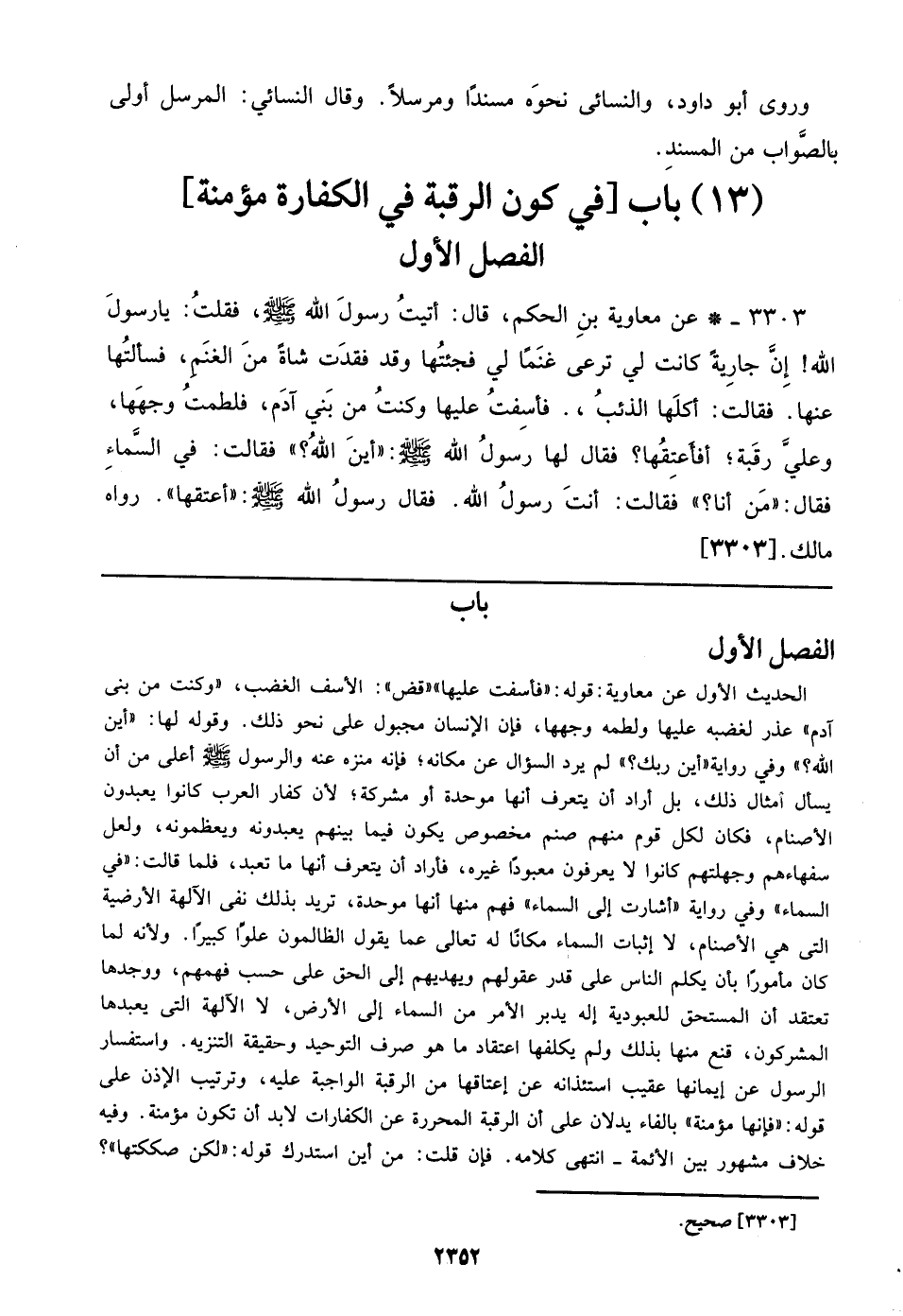 الحديث الأول عن معاوية: قوله: ((فأسفت عليها)) ((قض)): الأسف الغضب، ((وكنت من بني آدم)) عذر لغضبه عليها ولطمه وجهها، فإن الإنسان مجبول علي نحو ذلك. وقوله لها: ((أين الله؟)) وفي رواية ((أين ربك؟)) لم يرد السؤال عن مكانه؛ فإنه منزه عنه والرسول صلى الله عليه وسلم أعلي من أن يسأل أمثال ذلك، بل أراد أن يتعرف أنها موحدة أو مشركة؛ لأن كفار العرب كانوا يعبدون الأصنام، فكان لكل قوم منهم صنم مخصوص يكون فيما بينهم يعبدونه ويعظمونه، ولعل سفهاءهم وجهلتهم كانوا لا يعرفون معبودا غيره، فأراد أن يتعرف أنها ما تعبد، فلما قالت: ((في السماء)) وفي رواية ((أشارت إلي السماء)) فهم منها أنها موحدة، تريد بذلك نفي الآلهة الأرضية التي هي الأصنام، لا إثبات السماء مكانا له تعالي عما يقول الظالمون علوا كبيرا. ولأنه لما كان مأمورا بأن يكلم الناس علي قدر عقولهم ويهديهم إلي الحق علي حسب فهمهم، ووجدها تعتقد أن المستحق للعبودية إله يدبر الأمر من السماء إلي الأرض، لا الآلهة التي يعبدها المشركون، قنع منها بذلك ولم يكلفها اعتقاد ما هو صرف التوحيد وحقيقة التنزيه. واستفسار الرسول عن إيمانها عقيب استئذانه عن إعتاقها من الرقبة الواجبة عليه، وترتيب الإذن علي قوله: ((فإنها مؤمنة)) بالفاء يدلان علي أن الرقبة المحررة عن الكفارات لا بد أن تكون مؤمنة. وفيه خلاف مشهور بين الأئمة – انتهي كلامه. فإن قلت: من أين استدرك قوله: ((لكن صككتها))؟