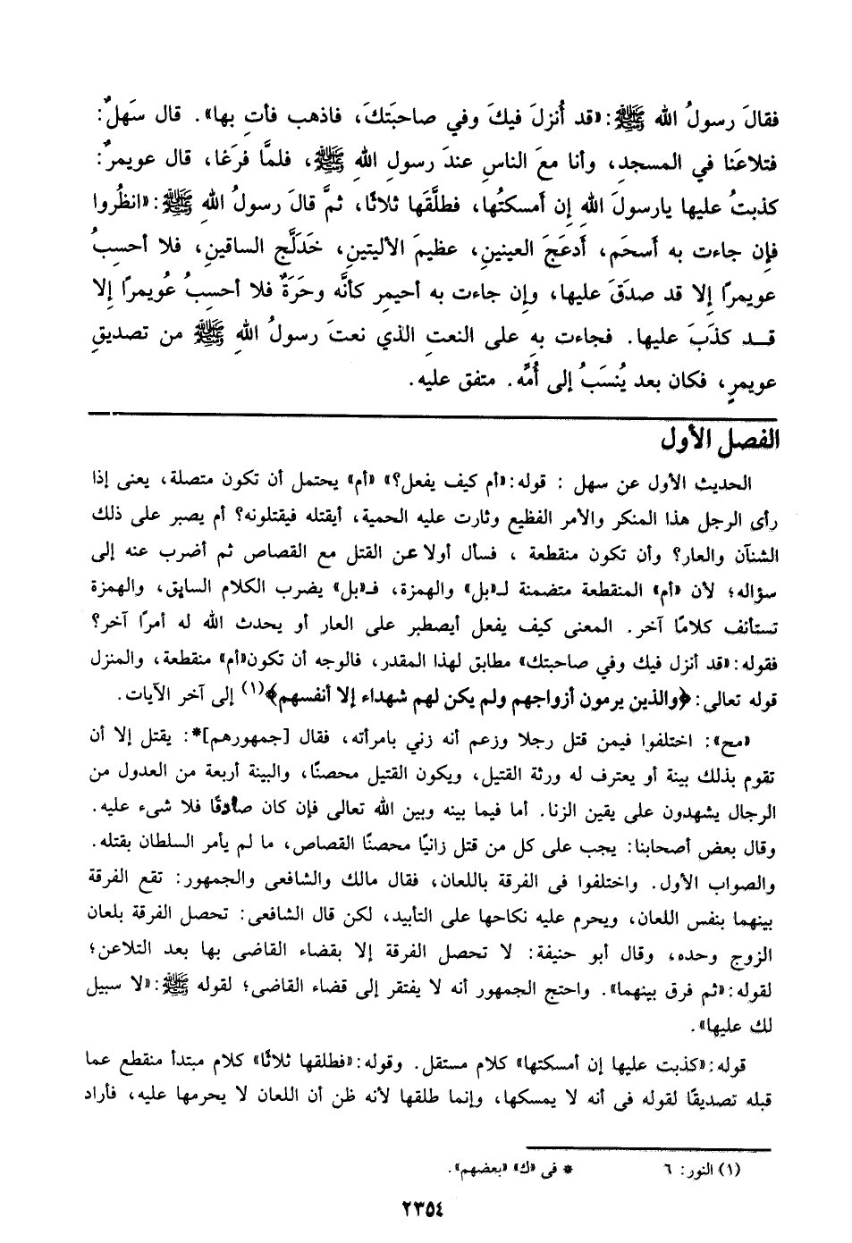 الحديث الأول عن سهل: قوله: ((أم كيف يفعل؟)) ((أم)) يحتمل أن تكون متصلة، يعني إذا رأي الرجل هذا المنكر والأمر الفظيع وثارت عليه الحمية، أيقتله فيقتلونه؟ أم يصبر علي ذلك الشنآن والعار؟ وأن تكون منقطعة، فسأل أولا عن القتل مع القصاص ثم أضرب عنه إلي سؤاله؛ لأن ((أم)) المنقطعة متضمنة لـ ((بل)) والهمزة، فـ ((بل)) يضرب الكلام السابق، والهمزة تستأنف كلاما آخر. المعنى كيف يفعل أيصبر علي العار أو يحدث الله له أمرا آخر؟ فقوله: ((قد أنزل فيل وفي صاحبتك)) مطابق لهذا المقدر، فالوجه أن تكون ((أم)) منقطعة، والمنزل قوله تعالي {والَّذِينَ يَرْمُونَ أَزْوَاجَهُمْ ولَمْ يَكُن لَّهُمْ شُهَدَاءُ إلاَّ أَنفُسُهُمْ} إلي آخر الآيات.