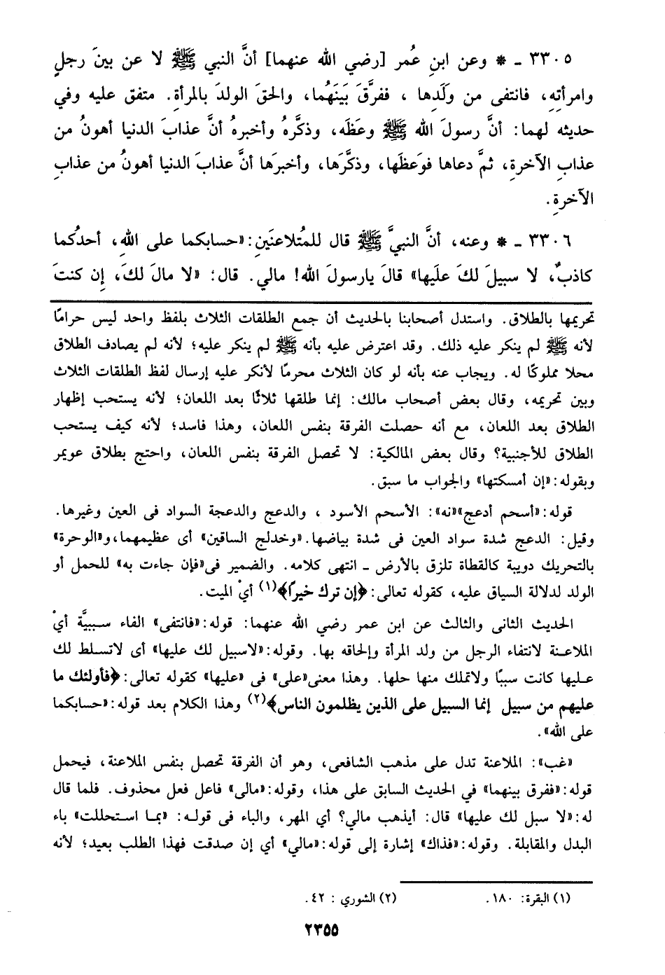 الحديث الثاني والثالث عن ابن عمر رضي الله عنهما: قوله: ((فانتفي)) الفاء سببية أي الملاعنة لانتفاء الرجل من ولد المرأة وإلحاقه بها. وقوله: ((لا سبيل لك عليها)) أي لا تسلط لك عليها كانت سببا ولا تملك منها حلها. وهذا معنى ((علي)) في ((عليها)) كقوله تعالي: {فَأُوْلَئِكَ مَا عَلَيْهِم مِّن سَبِيلٍ (41) إنَّمَا السَّبِيلُ عَلي الَّذِينَ يَظْلِمُونَ النَّاسَ} وهذا الكلام بعد قوله: ((حسابكما علي الله)).