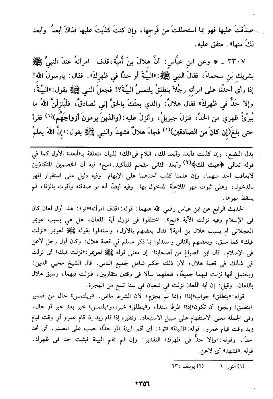 3307 - وعن ابن عباس: أن هلال بن أمية، قذف امرأته عند النبي صلى الله عليه وسلم بشريك بن سمحاء، فقال النبي صلى الله عليه وسلم: ((البينة أو حدا في ظهرك)). فقال: يا رسول الله! إذا رأي أحدنا علي امرأته رجلا ينطلق يلتمس البينة؟! فجعل النبي صلى الله عليه وسلم يقول: ((البينة، وإلا حد في ظهرك)) فقال هلال: والذي بعثك بالحق إني لصادق، فلينزلن الله ما يبرئ ظهري من الحد، فنزل جبريل، وأنزل عليه: {والَّذِينَ يَرْمُونَ أَزْوَاجَهُمْ} فقرأ حتى بلغ {إن كَانَ مِنَ الصَّادِقِينَ} فجاء هلال فشهد والنبي صلى الله عليه وسلم يقول: ((إن الله يعلم