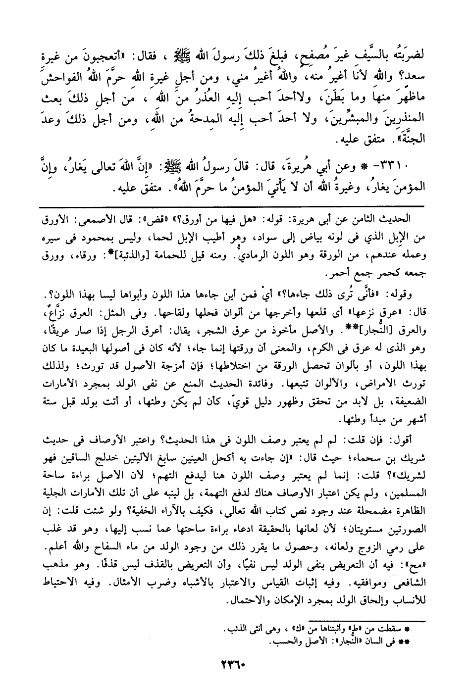 أقول: فإن قلت: لم لم يعتبر وصف اللون في هذا الحديث؟ واعتبر الأوصاف في حديث شريك بن سمحاء؛ حيث قال: ((إن جاءت به أكحل العينين سابغ الأليتين خدلج الساقين فهو لشريك))؟ قلت: إنما لم يعتبر وصف اللون هنا ليدفع التهم؛ لأن الأصل براءة ساحة المسلمين، ولم يكن اعتبار الأوصاف هناك لدفع التهمة، بل لينبه علي أن تلك الأمارات الجلية الظاهرة مضمحلة عند وجود نص كتاب الله تعالي، فكيف بالآراء الخفية؟ ولو شئت قلت: إن الصورتين مستويتان؛ لأن لعانها بالحقيقة ادعاء براءة ساحتها عما نسب إليها، وهو قد غلب علي رمي الزوج ولعانه، وحصول ما يقرر ذلك من وجود الولد من ماء السفاح والله أعلم.