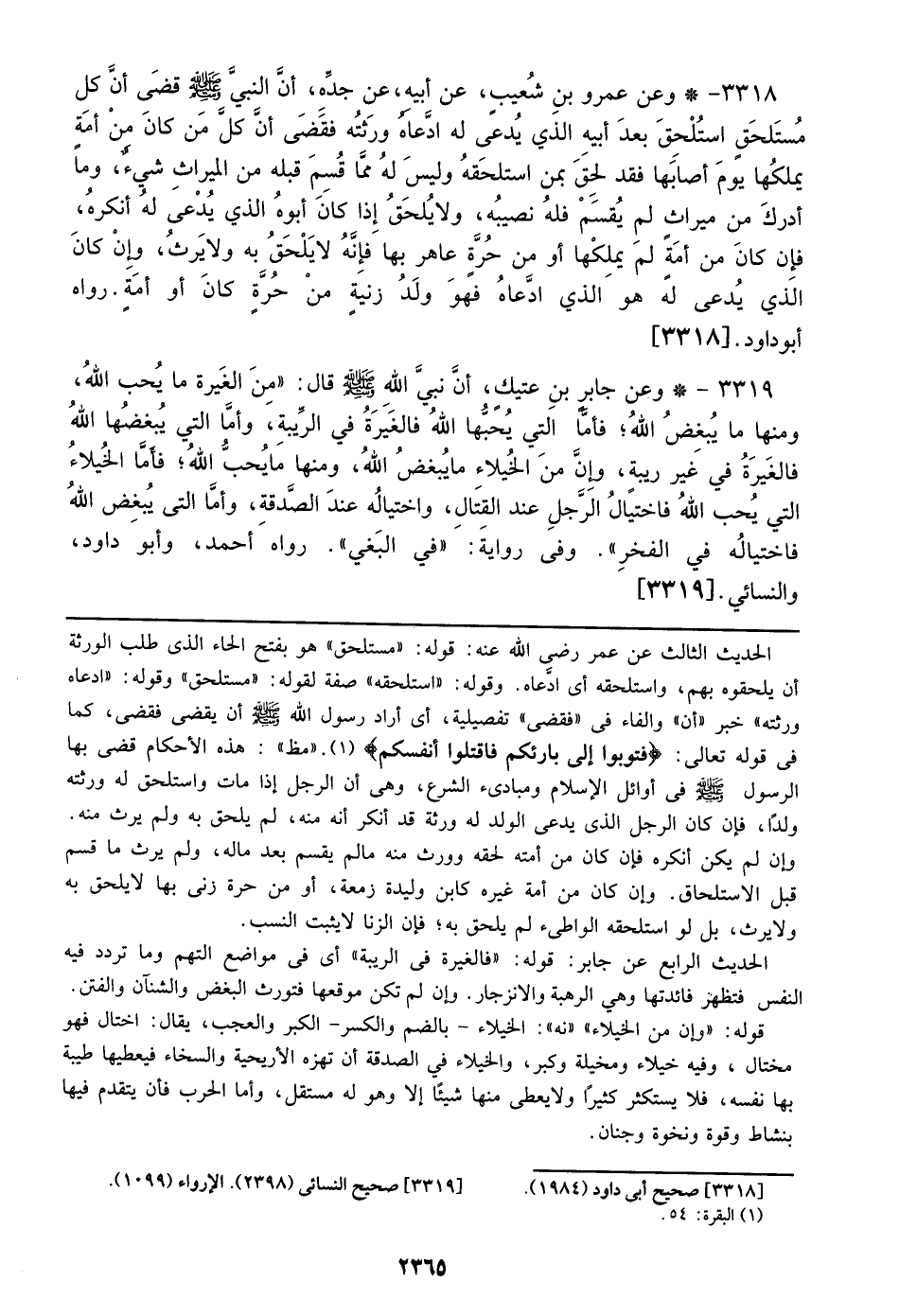 3318 - وعن عمرو بن شعيب، عن أبيه، عن جده، أن النبي صلى الله عليه وسلم قضى أن كل مستلحق استلحق بعد أبيه الذي يدعى له ادعاه ورثته فقضى أن كل من كان من أمة يملكها يوم أصابها فقد لحق بمن استلحقه وليس له مما قسم قبله من الميراث شيء، وما أدرك من ميراث لم يقسم فله نصيبه، ولا يلحق إذا كان أبوه الذي يدعى له أنكره، فإن كان من أمة لم يملكها أو من حرة عاهر بها فإنه لا يلحق به ولا يرث، وإن كان الذي يدعى له هو الذي ادعاه فهو ولد زنية من حرة كان أو أمة. رواه أبو داود. [3318]