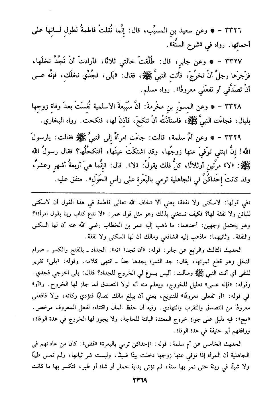 3328 - وعن المسور بن مخرمة: أن سبيعة الأسلمية نفست بعد وفاة زوجها بليال، فجاءت النبي صلى الله عليه وسلم، فاستأذنته أن تنكح، فأذن لها، فنكحت. رواه البخاري.