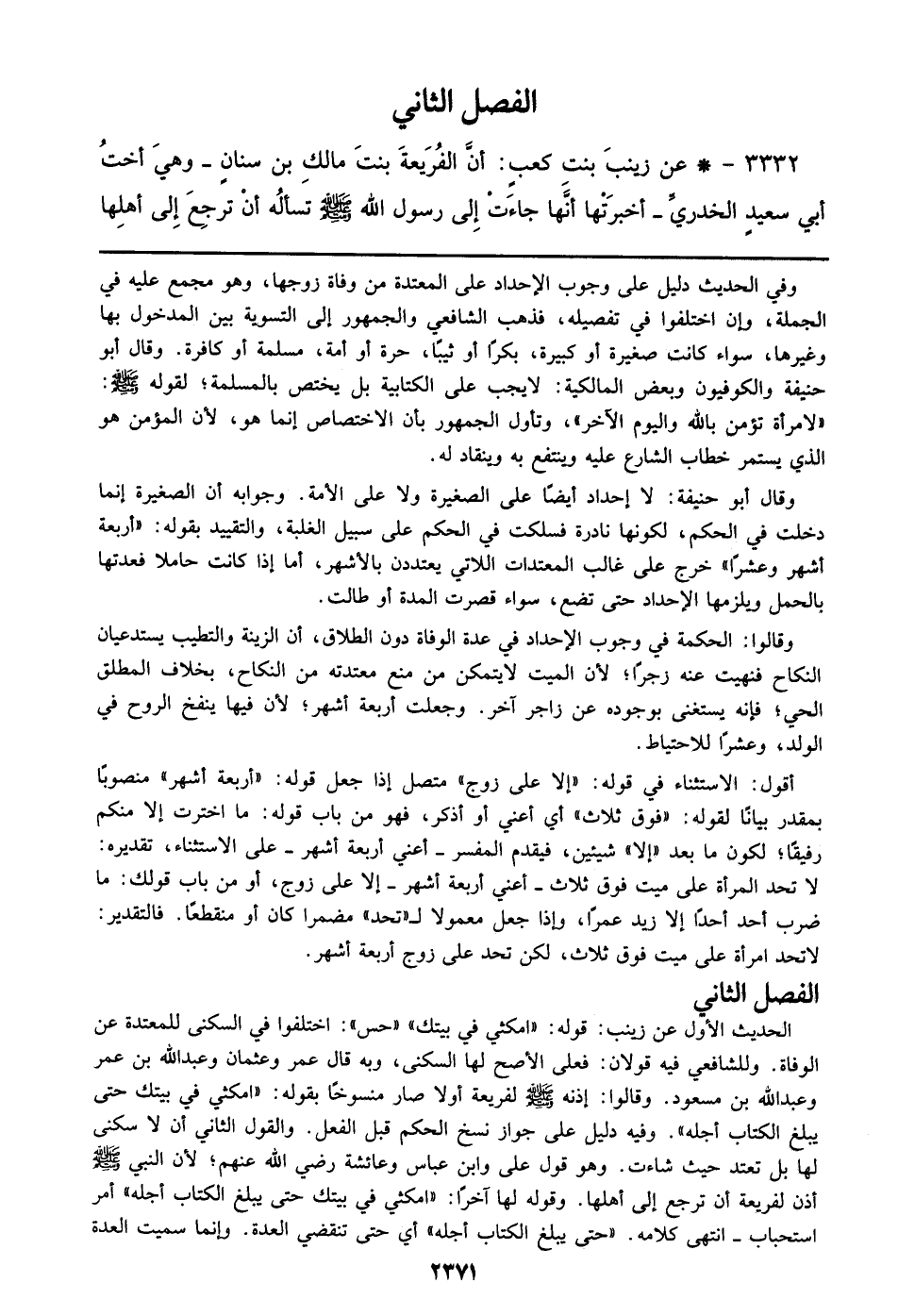 3332 - عن زينب بنت كعب: أن الفريعة بنت مالك بن سنان – وهي أخت أبي سعيد الخدري – أخبرتها أنها جاءت إلي رسول الله صلى الله عليه وسلم تسأله أن ترجع إلي أهلها