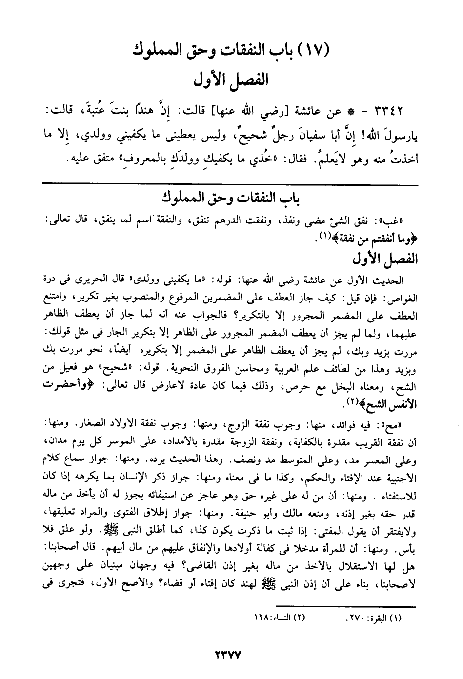 الحديث الأول عن عائشة رضي الله عنها: قوله: ((ما يكفيني وولدي)) قال الحريري في درة الغواص: فإن قيل: كيف جاز العطف علي المضمرين المرفوع والمنصوب بغير تكرير، وامتنع العطف علي المضمر المجرور إلا بالتكرير؟ فالجواب عنه أنه لما جاز أن يعطف الظاهر عليهما، ولما لم يجز أن يعطف المضمر المجرور علي الظاهر إلا بتكرير الجار في مثل قولك: مررت بزيد وبك، لم يجز أن يعطف الظاهر علي المضمر إلا بتكريره أيضا، نحو مررت بك وبزيد وهذا من لطائف علم العربية ومحاسن الفروق النحوية. قوله: ((شحيح)) هو فعيل من الشح، ومعناه البخل مع حرص، وذلك فيما كان عادة لا عارض قال تعالي: {وأُحْضِرَتِ الأَنفُسُ الشُّحَّ}.