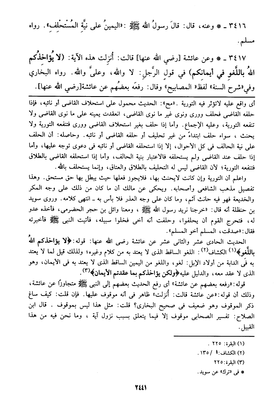 3417 - وعن عائشة [رضي الله عنها] قالت: أنزلت هذه الآية: {لا يُؤَاخِذُكُمُ اللَّهُ بِاللَّغْوِ فِي أَيْمَانِكُمْ} في قول الرجل: لا والله، وعلي الله. رواه البخاري وفي ((شرح السنة)) لفظ ((المصابيح)) وقال: رفعه بعضهم عن عائشة [رضي الله عنها].