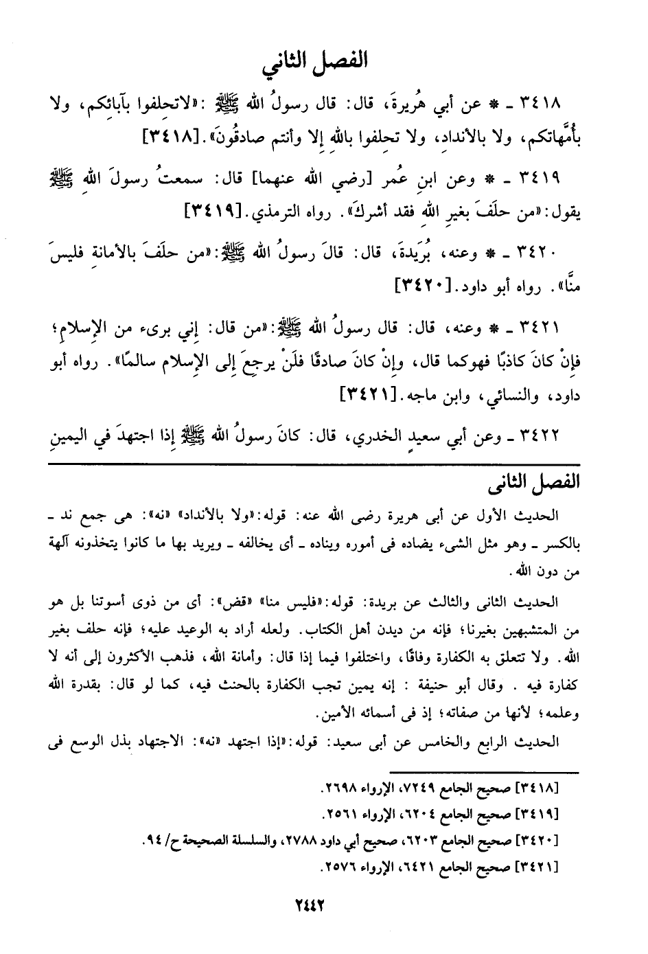 3419 - وعن ابن عمر [رضي الله عنهما] قال: سمعت رسول الله صلى الله عليه وسلم يقول: ((من حلف بغير الله فقد أشرك)). رواه الترمذي. [3419]