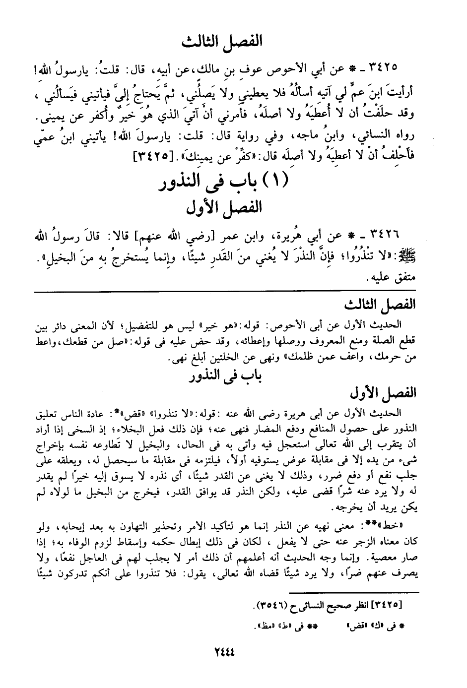 3426 - عن أبي هريرة، وابن عمر [رضي الله عنهم] قالا: قال رسول الله صلى الله عليه وسلم: ((لا تنذروا؛ فإن النذر لا يغني من القدر شيئاً، وإنما يستخرج به من البخيل)). متفق عليه.