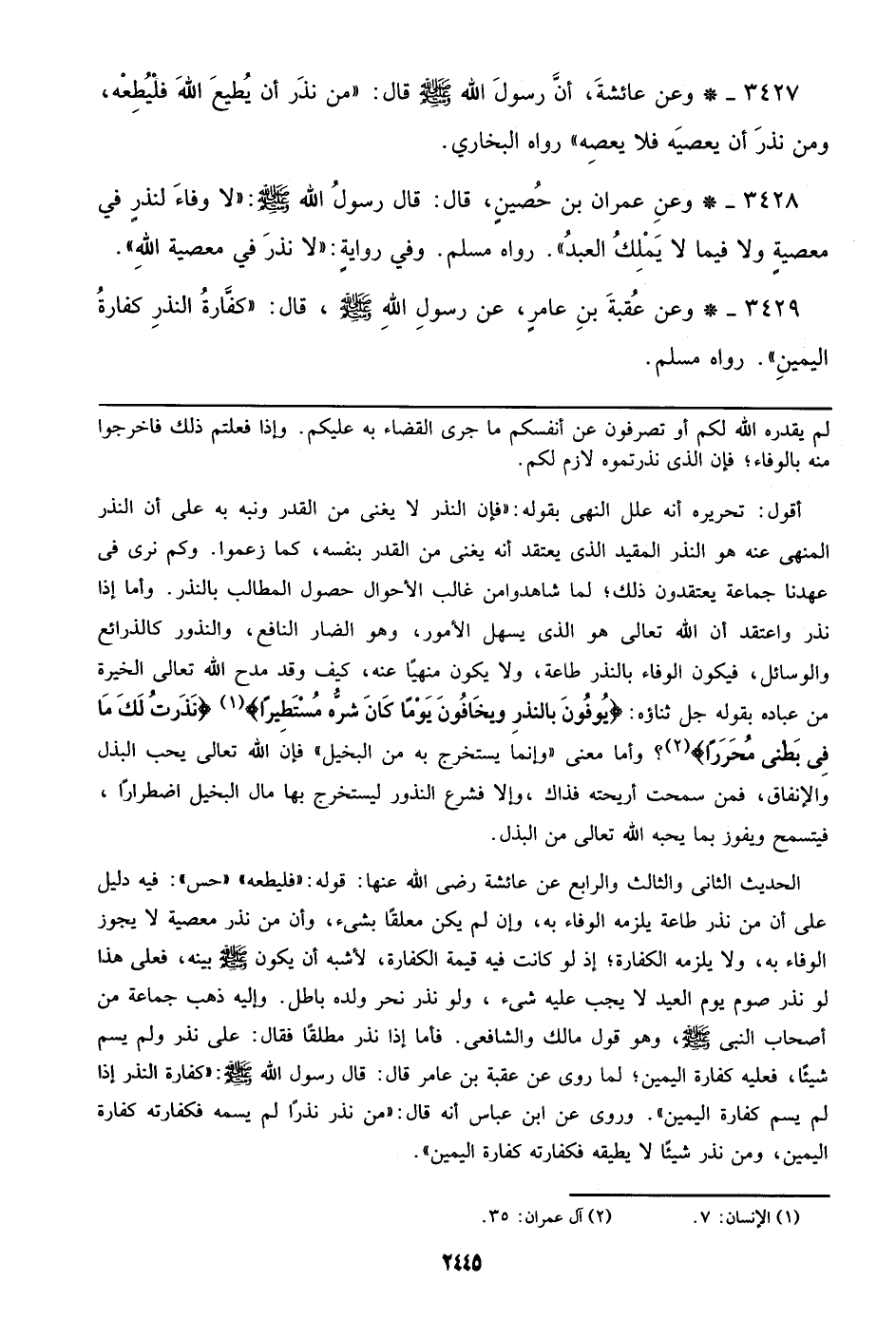 الحديث الثاني والثالث والرابع عن عائشة رضي الله عنها: قوله: ((فليطعه)) ((حس)): فيه دليل علي أن من نذر طاعة يلزمه الوفاء به، وإن لم يكن معلقاً بشيء، وأن من نذر معصية لا يجوز الوفاء به، ولا يلزمه الكفارة؛ إذ لو كانت فيه قيمة الكفارة، لأشبه أن يكون صلى الله عليه وسلم بينه، فعلي هذا لو نذر صوم يوم العيد لا يجب عليه شيء، ولو نذر نحر ولده باطل. وإليه ذهب جماعة من أصحاب النبي صلى الله عليه وسلم، وهو قول مالك والشافعي. فأما إذا نذر مطلقاً فقال: علي نذر ولم يسم شيئاً، فعليه كفارة اليمين؛ لما روى عن عقبة بن عامر قال: قال رسول الله صلى الله عليه وسلم: ((كفارة النذر إذا لم يسم كفارة اليمين)). وروى عن ابن عباس أنه قال: ((من نذر نذراً لم يسمه فكفارته كفارة اليمين، ومن نذر شيئاً لا يطيقه فكفارته كفارة اليمين))