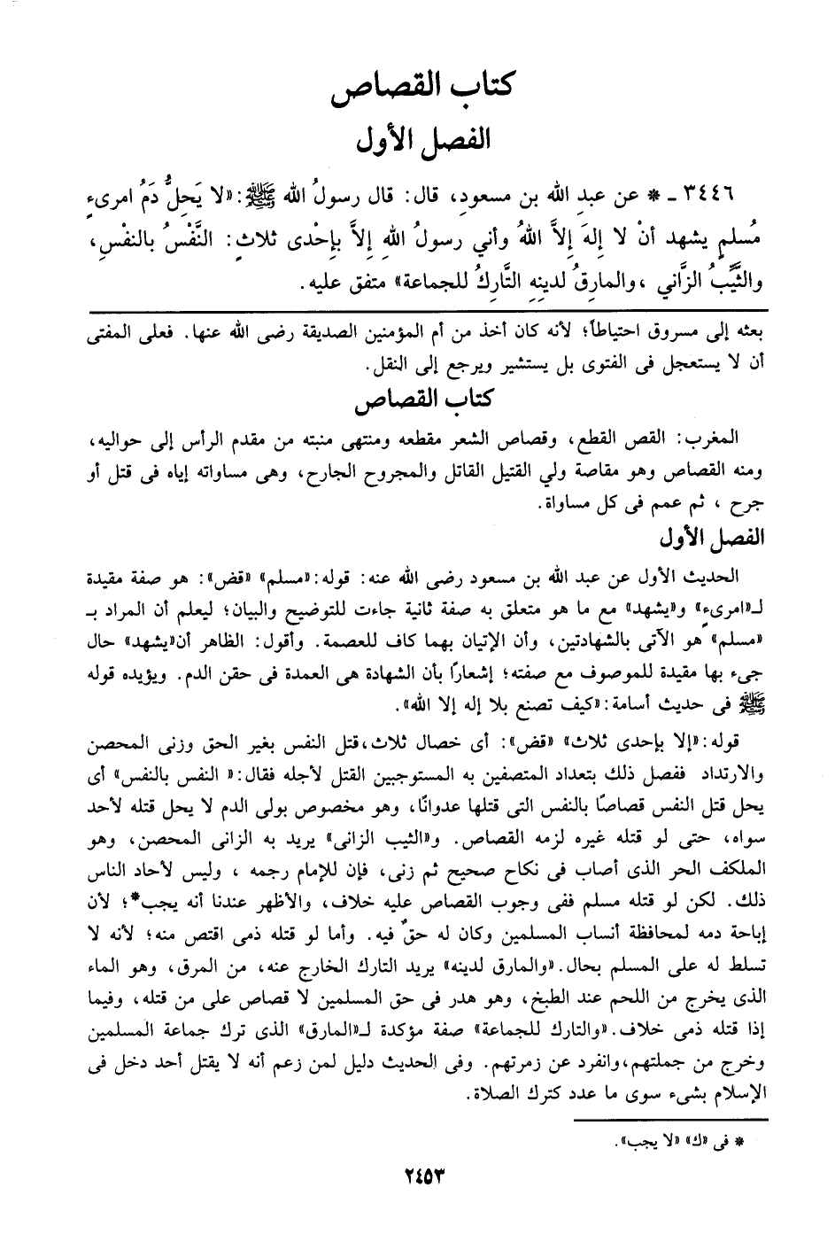 3446 - عن عبد الله بن مسعود، قال: قال رسول الله صلى الله عليه وسلم: ((لا يحل دم امرئ مسلم يشهد أن لا إله إلا الله وإني رسول الله إلا بإحدى ثلاث: النفس بالنفس، والثيب الزإني، والمارق لدينه التارك للجماعة)) متفق عليه.