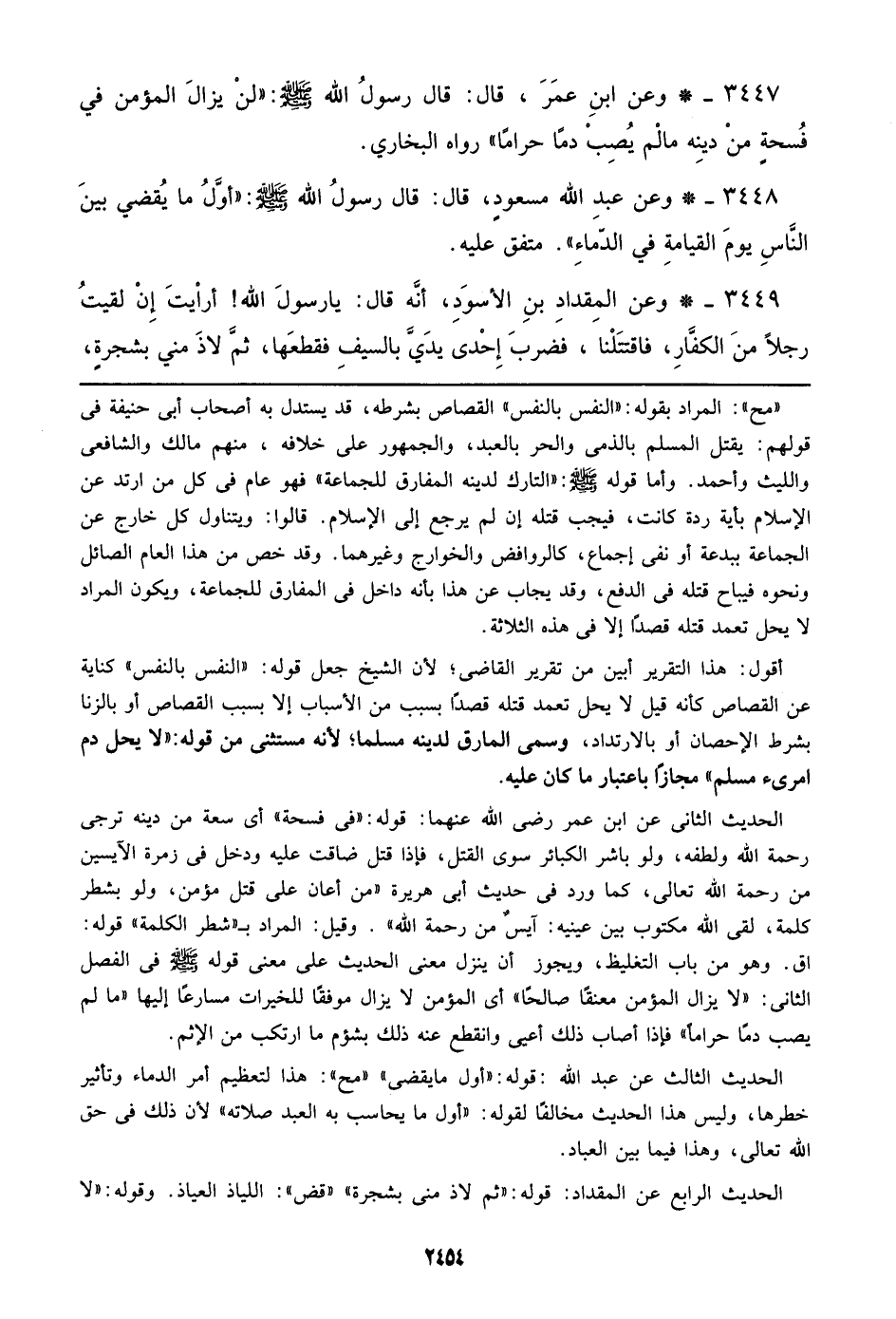 الحديث الثاني عن ابن عمر رضي الله عنهما: قوله: ((في فسحة)) أي سعة من دينه ترجى رحمة الله ولطفه، ولو باشر الكبائر سوى القتل، فإذا قتل ضاقت عليه ودخل في زمرة الآيسين من رحمة الله تعالي، كما ورد في حديث أبي هريرة ((من أعان علي قتل مؤمن، ولو بشطر كلمة، لقي الله مكتوب بين عينيه: آيس من رحمة الله)). وقيل: المراد بـ ((شطر الكلمة)) قوله: اق. وهو من باب التغليظ، ويجوز أن ينزل معنى الحديث علي معنى قوله صلى الله عليه وسلم في الفصل الثاني: ((لا يزال المؤمن معنقاً صالحاً)) أي المؤمن لا يزال موفقاً للخيرات مسارعاً إليها ((ما لم يصب دماً حراماً)) فإذا أصاب ذلك أعيي وانقطع عنه ذلك بشؤم ما ارتكب من الإثم.