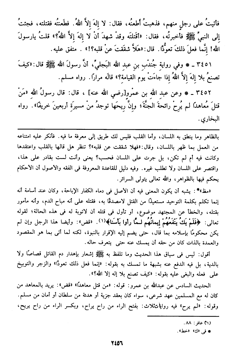 3452 - وعن عبد الله بن عمرو [رضي الله عنه]، قال: قال رسول الله ((من قتل معاهداً لم يرح رائحة الجنة؛ وإن ريحها توجد من مسيرة أربعين خريفاً)). رواه البخاري.