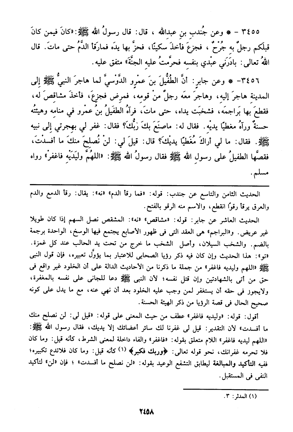 3456 - وعن جابر: أن الطفيل بن عمرو الدوسي لما هاجر النبي صلى الله عليه وسلم إلي المدينة هاجر إليه، وهاجر معه رجل من قومه، فمرض فجزع، فأخذ مشاقص له، فقطع بها براجمه، فشخبت يداه، حتى مات، فرآه الطفيل بن عمرو في منامه وهيئته حسنة ورآه مغطياً يديه. فقال له: ما صنع بك ربك؟ فقال: غفر لي بهجرتي إلي نبيه صلى الله عليه وسلم. فقال: ما لي أراك مغطياً يديك؟ قال: قيل لي: لن نصلح منك ما أفسدت، فقصها الطفيل علي رسول الله صلى الله عليه وسلم فقال رسول الله صلى الله عليه وسلم: ((اللهم وليديه فاغفر)) رواه مسلم.