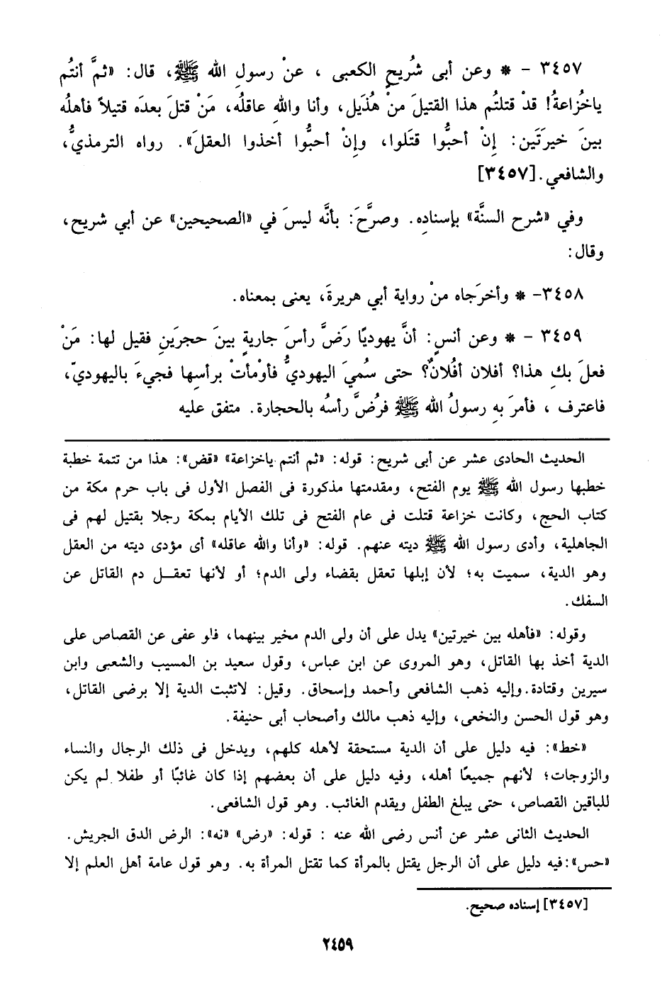 3457 - وعن أبي شريح الكعبي، عن رسول الله صلى الله عليه وسلم، قال: ((ثم أنتم يا خزاعة! قد قتلتم هذا القتيل من هذيل، وأنا والله عاقله، من قتل بعده قتيلاً فأهله بين خيرتين: إن أحبوا قتلوا، وإن أحبوا أخذوا العقل)). رواه الترمذي، والشافعي. [3457]