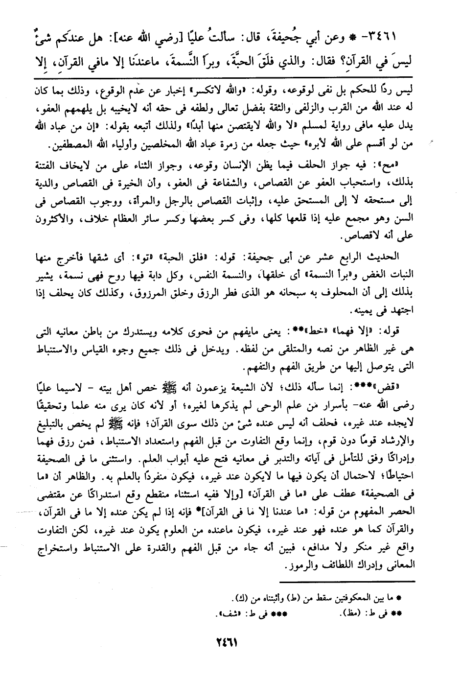 3461 - وعن أبي جحيفة، قال: سألت علياً [رضي الله عنه]: هل عندكم شيء ليس في القرآن؟ فقال: والذي فلق الحبة، وبرأ النسمة، ما عندنا إلا ما في القرآن، إلا