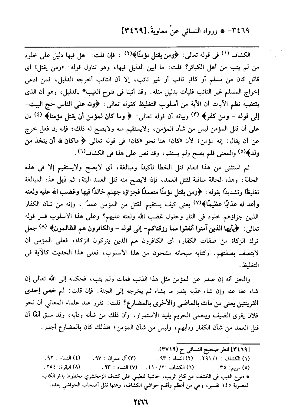 الكشاف في قوله تعالي: {ومَن يَقْتُلْ مُؤْمِنًا}: فإن قلت: هل فيها دليل علي خلود من لم يتب من أهل الكبائر؟ قلت: ما أبين الدليل فيها، وهو تناول قوله: ((ومن يقتل)) أي قاتل كان من مسلم أو كافر تائب أو غير تائب، إلا أن التائب أخرجه الدليل، فمن ادعى إخراج المسلم علي التائب فليأت بدليل مثله. وقد أتينا في فتوح الغيب بالدليل، وهو أن الذي يقتضيه نظم الآيات أن الآية من أسلوب التغليظ كقوله تعالي: {ولِلَّهِ عَلي النَّاسِ حِجُّ البَيْتِ - إلي قوله - ومَن كَفَرَ} وبيان أن قوله تعالي: {ومَا كَانَ لِمُؤْمِنٍ أَن يَقْتُلَ مُؤْمِنًا} دل علي أن قتل المؤمن ليس من شأن المؤمن، ولا يستقيم منه ولا يصح له ذلك؛ فإنه إن فعل خرج عن أن يقال: إنه مؤمن؛ لأن ((كان)) هنا نحو ((كان)) في قوله تعالي {مَا كَانَ لِلَّهِ أَن يَتَّخِذَ مِن ولَدٍ} والمعنى فلم يصح ولم يستقم، وقد نص علي هذا في الكشاف.