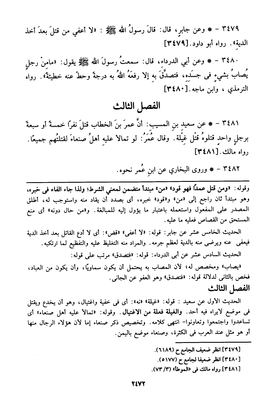 3481 - عن سعيد بن المسيب: أن عمر بن الخطاب قتل نفراً خمسة أو سبعة برجل واحد قتلوه قتل غيلة. وقال عمر: لو تمالأ عليه أهل صنعاء لتقلتهم جميعاً. رواه مالك. [3481]
