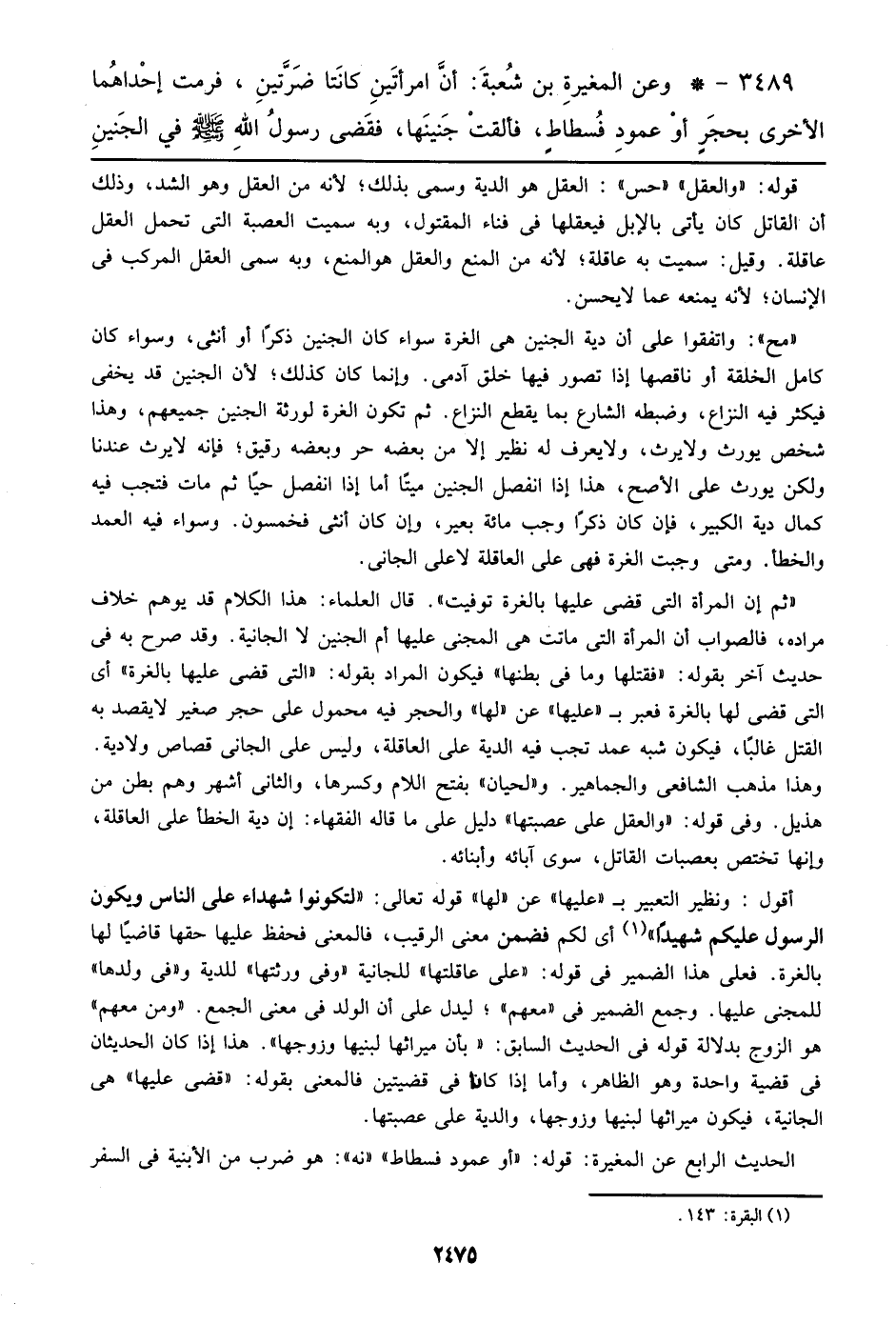 3489 - وعن المغيرة بن شعبة: أن امرأتين كانتا ضرتين، فرمت إحداهما الأخرى بحجر أو عمود فسطاط، فألقت جنينها، فقضى رسول الله صلى الله عليه وسلم في الجنين