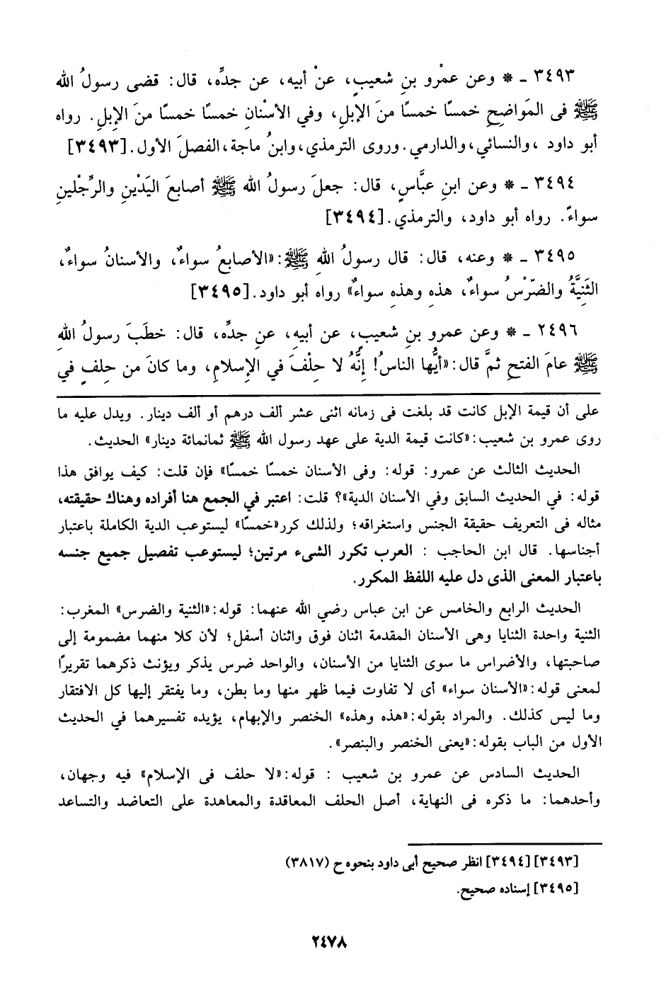 3493 - وعن عمرو بن شعيب، عن أبيه، عن جده، قال: قضى رسول الله صلى الله عليه وسلم في المواضح خمساً خمساً من الإبل، وفي الأسنان خمساً خمساً من الإبل. رواه أبو داود، والنسائي، والدارمي. وروى الترمذي، وابن ماجه، الفصل الأول. [3493]