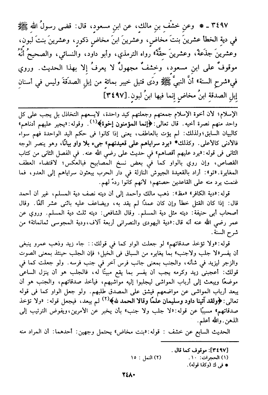 3497 - وعن خشف بن مالك، عن ابن مسعود، قال: قضى رسول الله صلى الله عليه وسلم في دية الخطأ عشرين بيت مخاض، وعشرين ابن مخاض ذكور، وعشرين بنت لبون، وعشرين جذعة، وعشرين حقه)) رواه الترمذي، وأبو داود، والنسائي، والصحيح انه موقوف علي ابن مسعود، وخشف مجهول لا يعرف إلا بهذا الحديث، وروي في ((شرح السنة)) أن النبي صلى الله عليه وسلم ودى قتيل خيبر بمائة من إبل الصدقة وليس في أسنان إبل الصدقة ابن مخاض إنما فيها ابن لبون. [3497]
