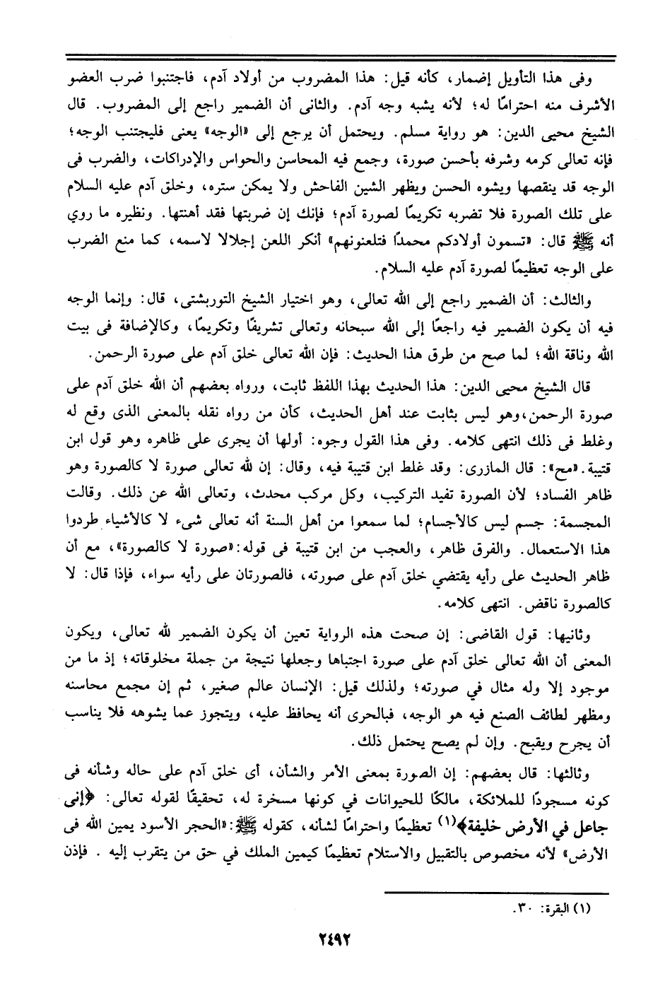 وثالثها: قال بعضهم: إن الصورة بمعنى الأمر والشأن أي خلق آدم علي حاله وشأنه في كونه مسجودا للملائكة، مالكا للحيوانات في كونها مسخرة له، تحقيقا لقوله تعالي: {إني جَاعِلٌ فِي الأَرْضِ خَلِيفَةً} تعظيما واحتراما لشانه، كقوله صلى الله عليه وسلم: الحجر الأسود يمين الله في الأرض)) لأنه مخصوص بالتقبيل والاستلام تعظيما كيمين الملك في حق من يتقرب إليه. فإذن