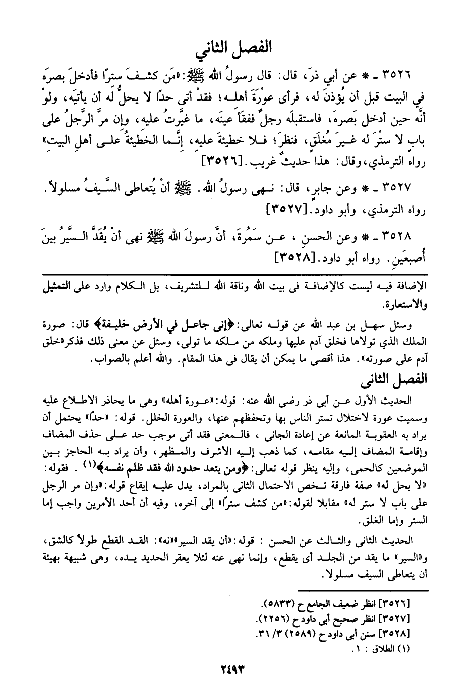 الحديث الأول عن أبي ذر رضي الله عنه: قوله: ((عورة أهله)) وهي ما يحاذ الاطلاع عليه وسميت عورة لاختلال تستر الناس بها وتحفظهم عنها، والعورة الخلل. قوله: ((حدا)) يحتمل أن يراد به العقوبة المانعة عن إعادة الجإني، فالمعنى فقد أتى موجب حد حذف المضاف وإقامة المضاف إليه مقامه، كما ذهب إليه الأشرف والمظهر، وان يراد به الحجز بين الموضوعين كالحمى، وإليه ينظر قوله تعالي: {ومَن يَتَعَدَّ حُدُودَ اللَّهِ فَقَدْ ظَلَمَ نَفْسَهُ}. فقوله: ((لا يحل له)) صفة فارقة تخص الاحتمال الثاني بالمراد، يدل عليه إيقاع قوله: ((إن مر الرجل علي باب لا ستر له)) مقابلا لقوله: ((من كشف سترا)) إلي آخره، وفيه أن أحد الأمرين واجب إما الستر وإما الغلق.