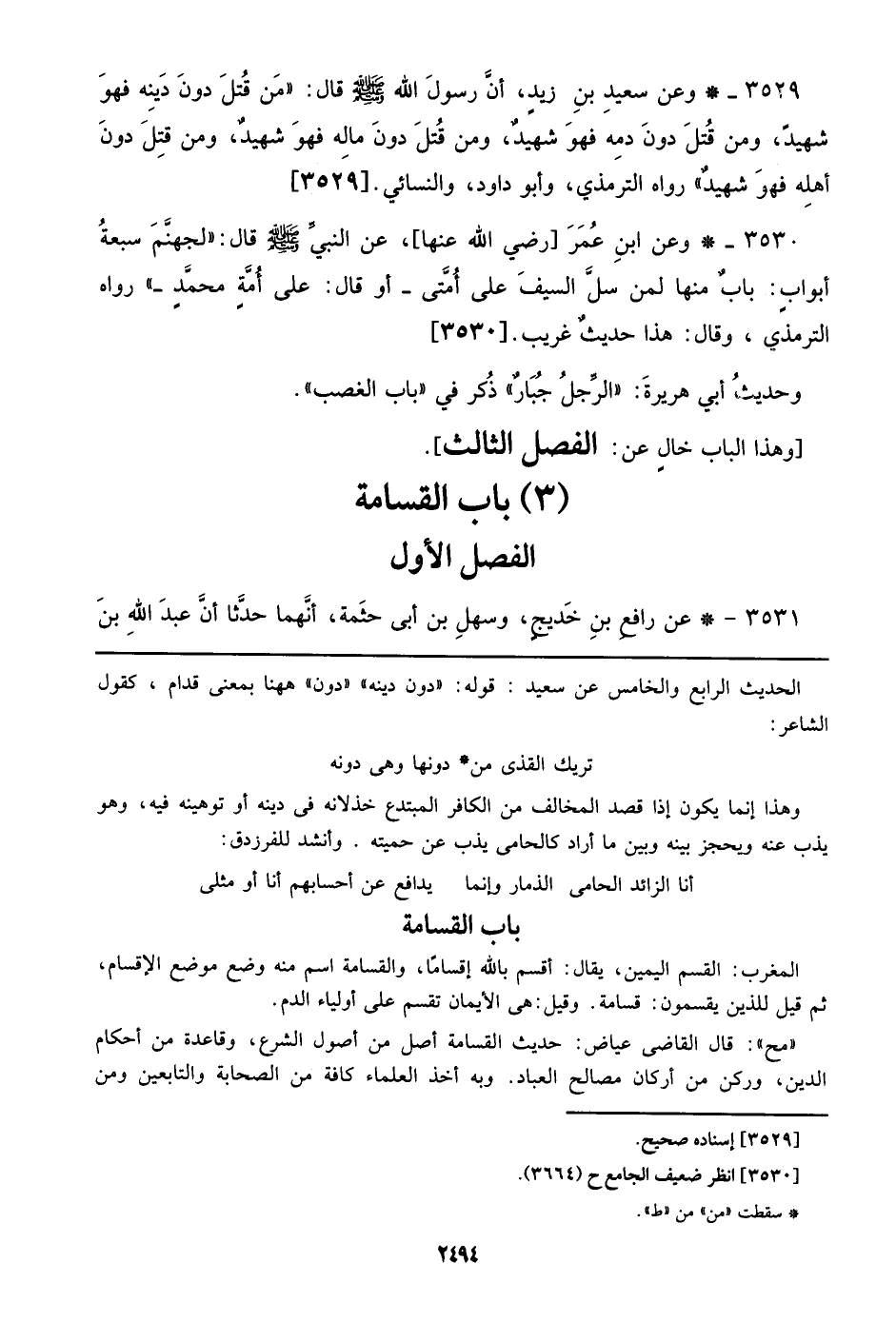 3529 - وعن سعيد بن زيد، أن رسول الله صلى الله عليه وسلم قال: ((من قتل دون دينه فهو شهيد، ومن قتل دون دمه فهو شهيد، ومن قتل دون ماله فهو شهيد، ومن قتل دون أهله فهو شهيد)) رواه الترمذي، وأبو داود، والنسائي. [3529]