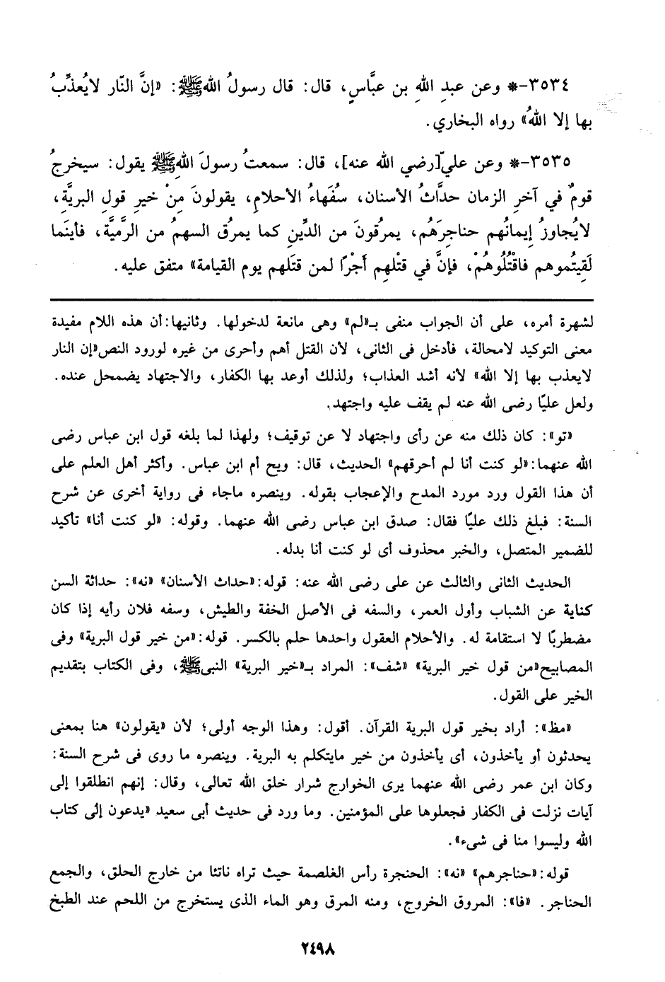 3535 - وعن علي [رضي الله عنه]، قال: سمعت من رسول الله صلى الله عليه وسلم يقول: سيخرج قوم في آخر الزمان حداث الأسنان، سفهاء الأحلام، يقولون من خير قول البرية، لا يجاوز أيمانهم حناجرهم، يمرقون من الدين كما يمرق السهم من الرمية، فأينما لقيتموهم فاقتلوهم، فإن في قتلهم أجر لمن قتلهم يوم القيامة)) متفق عليه.