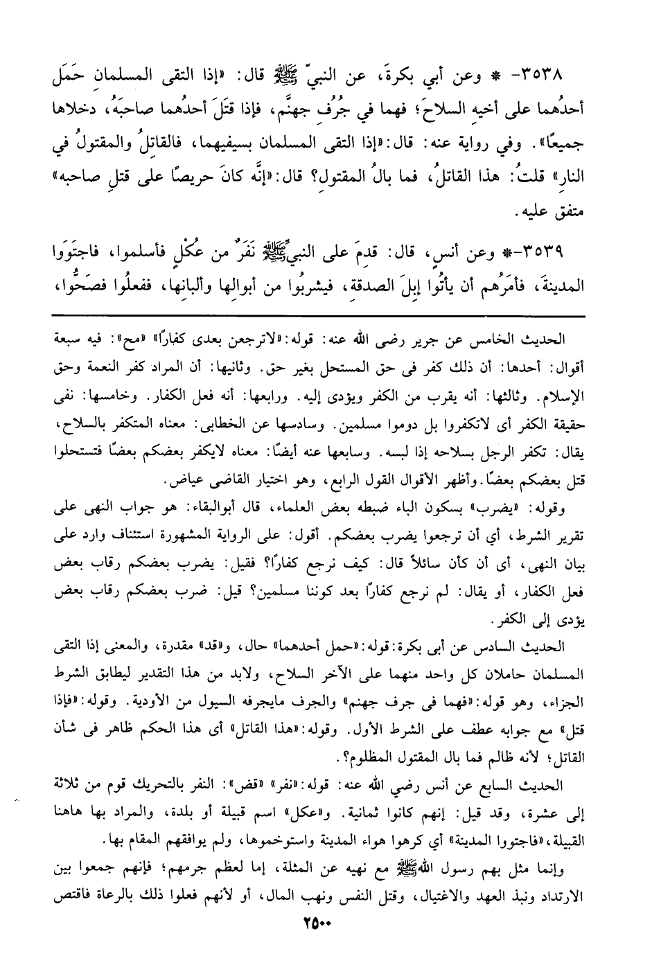 الحديث الخامس عن جرير رضي الله عنه: قوله: ((لا ترجعن بعدي كفارا)) ((مح)): فيه سبعة أقوال: أحدهما: أن ذلك كفر في حق المستحيل بغير حق. وثإنيها: أن المراد كفر النعمة وحق الإسلام. وثالثها: أنه يقرب من الكفر ويؤدي إليه. ورابعها: أنه فعل الكفار. وخامسها: نفي حقيقة الكفر أي لا تكفروا بل دوموا مسلمين. وسادسا عن الخطابي: معناه المتكفر بالسلاح، يقال: تكفر الرجل بسلاحه إذا لبسه. وسابعها عنه أيضا: معناه لا يكفر بعضكم بعضا فتستحلوا قتل بعضكم بعضا. واظهر الأقوال القول الرابع، وهو اختيار القاضي عياض.