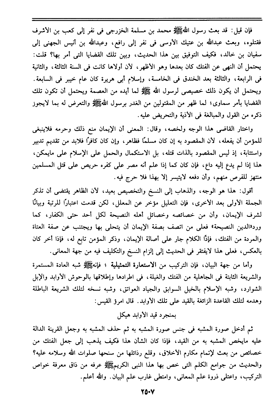 وأما من جهة البيان، فإن التركيب من الاستعارة التمثيلية؛ فإنه صلى الله عليه وسلم شبه العادة المستمرة والشريعة الثابتة في الجاهلية من الفتك والغيلة، في اطرادها وإطلاقها بالوحوش الأوابد والإبل الشوارد، وشبه الإسلام بالخيل السوابق والجياد العواتق، وشبه نسخه لتلك الشريعة الباطلة وهدمه لتلك القاعدة الزائغة بالقيد علي تلك الأوابد. قال امرؤ القيس: