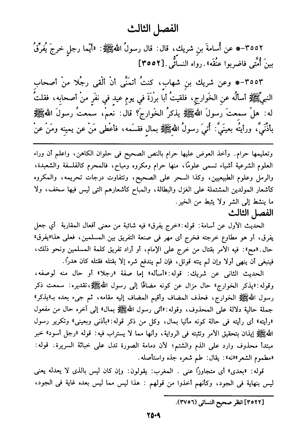 3553 - وعن شريك بن شهاب، كنت أتمنى أن ألقى رجلاً من أصحاب النبي صلى الله عليه وسلم أسأله عن الخوارج، فلقيت أبا برزة في يوم عيد في نفر من أصحابه، فقلت له: هل سمعت رسول الله صلى الله عليه وسلم يذكر الخوارج؟ قال: نعم، سمعت رسول الله صلى الله عليه وسلم بأذني، ورأيته بعيني: أتى رسول الله صلى الله عليه وسلم بمال فقسمه، فأعطى من عن يمينه ومن عن
