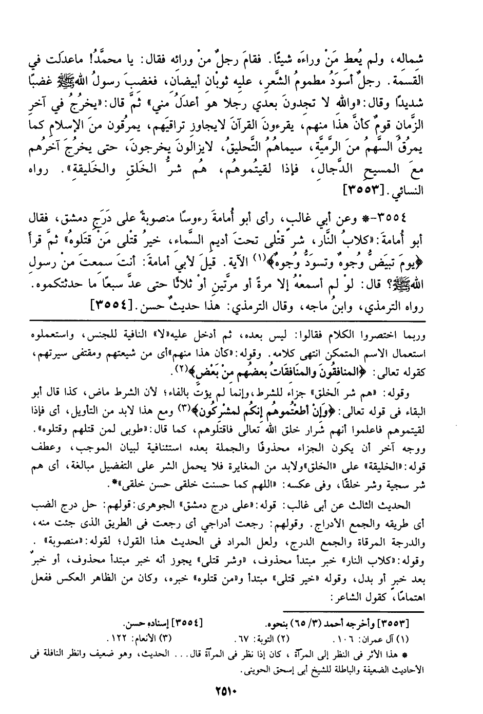 3554 - وعن أبي غالب، رأي أبو أمامة رءوساً منصوبةً علي درج دمشق، فقال أبو أمامة: ((كلاب النار، شر قتلي تحت أديم السماء، خير قتلي من قتلوه)) ثم قرأ {يَوْمَ تَبْيَضُّ وجُوهٌ وتَسْوَدُّ وجُوهٌ} الآية. قيل لأبي أمامة: أنت سمعت من رسول الله صلى الله عليه وسلم؟ قال: لو لم أسمعه إلا مرة أو مرتين أو ثلاثاً حتى عد سبعاً ما حدثتكموه. رواه الترمذي، وابن ماجه، وقال الترمذي: هذا حديث حسن. [3554]