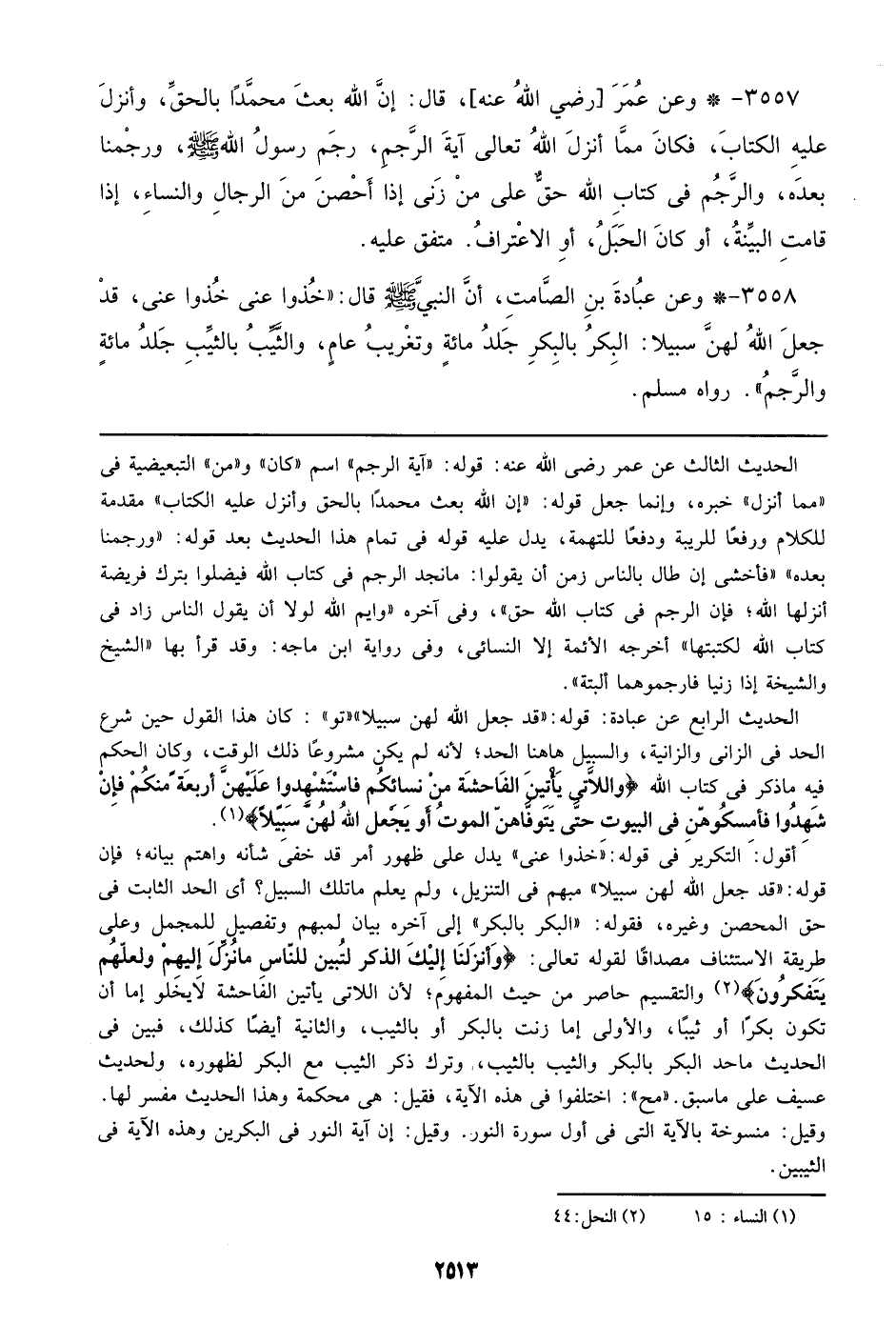 3557 - وعن عمر [رضي الله عنه]، قال: إن الله بعث محمداً بالحق، وأنزل عليه الكتاب، فكان مما أنزل الله تعالي آية الرجم، رجم رسول الله صلى الله عليه وسلم، ورجمنا بعده، والرجم في كتاب الله حق علي من زنى إذا أحصن من الرجال والنساء، إذا قامت البينة، أو كان الحبل، أو الاعتراف. متفق عليه.