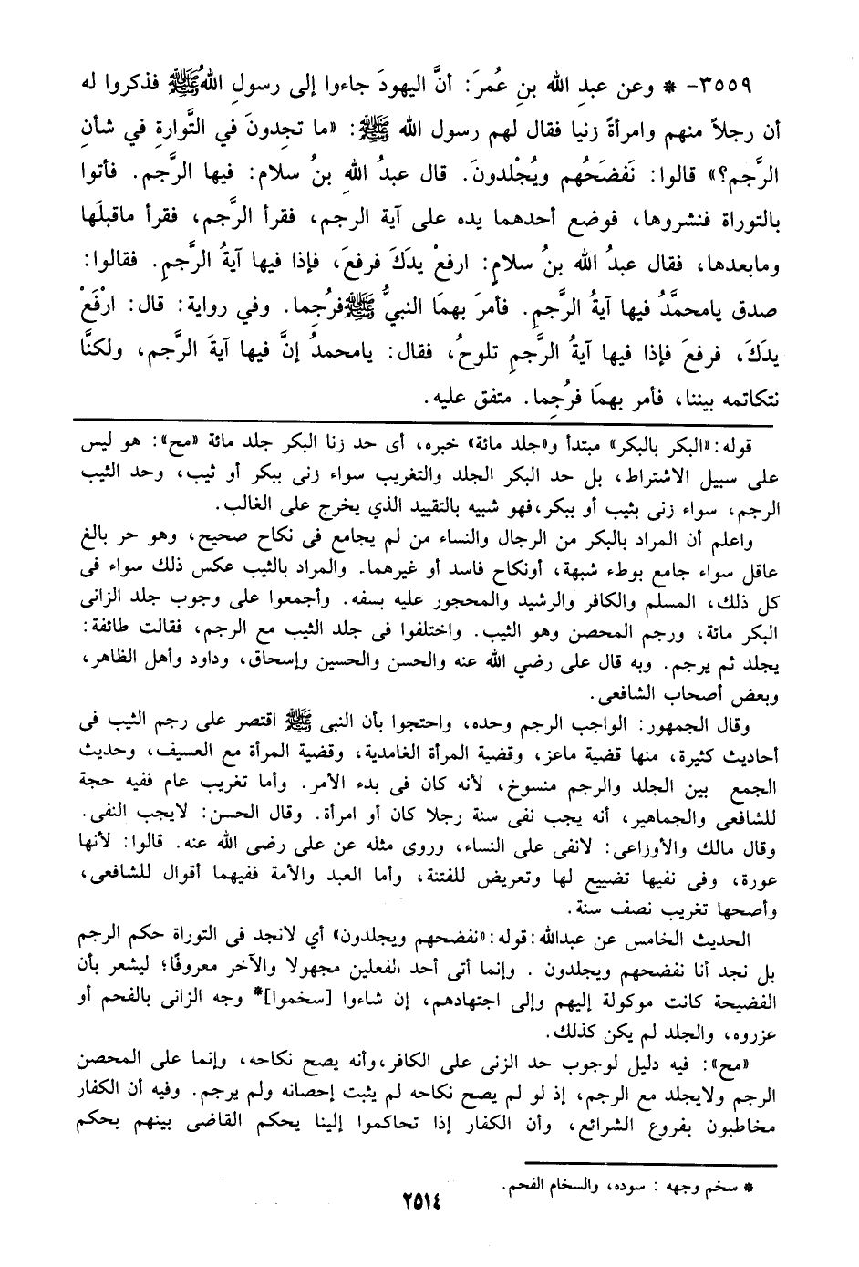 3559 - وعن عبد الله بن عمر: أن اليهود جاءوا إلي رسول الله صلى الله عليه وسلم فذكروا له أن رجلاً منهم وامرأة زنيا فقال لهم رسول الله صلى الله عليه وسلم: ((ما تجدون في التوراة في شأن الرجم؟)) قالوا: نفضحهم ويجلدون. قال عبد الله بن سلام: فيها الرجم. فأتوا بالتوراة فنشروها، فوضع أحدهما يده علي آية الرجم، فقرأ الرجم، فقرأ ما قبلها وما بعدها، فقال عبد الله بن سلام: ارفع يدك فرفع، فإذا فيها آية الرجم. فقالوا: صدق يا محمد فيها آية الرجم. فأمر بهما النبي صلى الله عليه وسلم فرجما. وفي رواية: قال: ارفع يدك، فرفع فإذا فيها آية الرجم تلوح، فقال: يا محمد إن فيها آية الرجم، ولكنا نتكاتمه بيننا، فأمر بهما فرجما. متفق عليه.