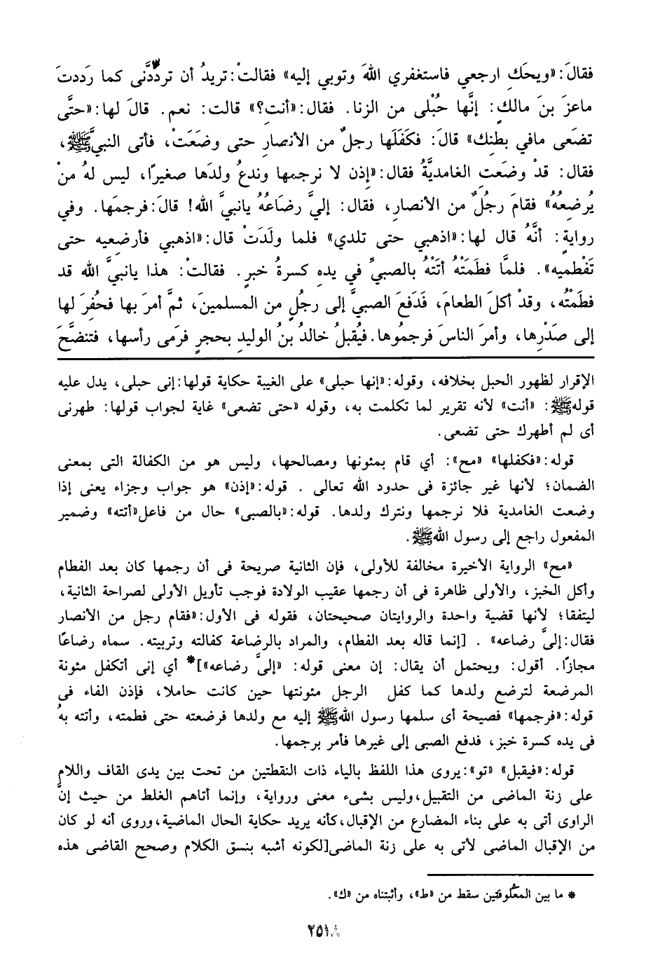 فقال: ((ويحك ارجعي فاستغفري الله وتوبي إليه)) فقال: تريد أن ترددني كما رددت ماعز بن مالك: إنها حبلي من الزنا. فقال: ((أنت؟)) قالت: نعم. قال لها: ((حتى تضعي ما في بطنك)) قال: فكفلها رجل من الأنصار حتى وضعت، فأتى النبي صلى الله عليه وسلم، فقال: قد وضعت الغامدية فقال: ((إذن لا نرجمها وندع ولدها صغيراً، ليس له من يرضعه)) فقام رجل من الأنصار، فقال: إلي رضاعة با نبي الله! قال: فرجمها. وفي رواية: أنه قال لها: ((اذهبي حتى تلدي)) فلما ولدت قال: ((اذهبي فأرضعيه حتى تفطميه)). فلما فطمته أتته بالصبي في يده كسرة خبر. فقالت: هذا يا نبي الله قد فطمته، وقد أكل الطعام، فدفع الصبي إلي رجل من المسلمين، ثم أمر بها فحفر لها إلي صدرها، وأمر الناس فرجموها. فيقبل خالد بن الوليد بحجر فرمى رأسها، فتنضح
