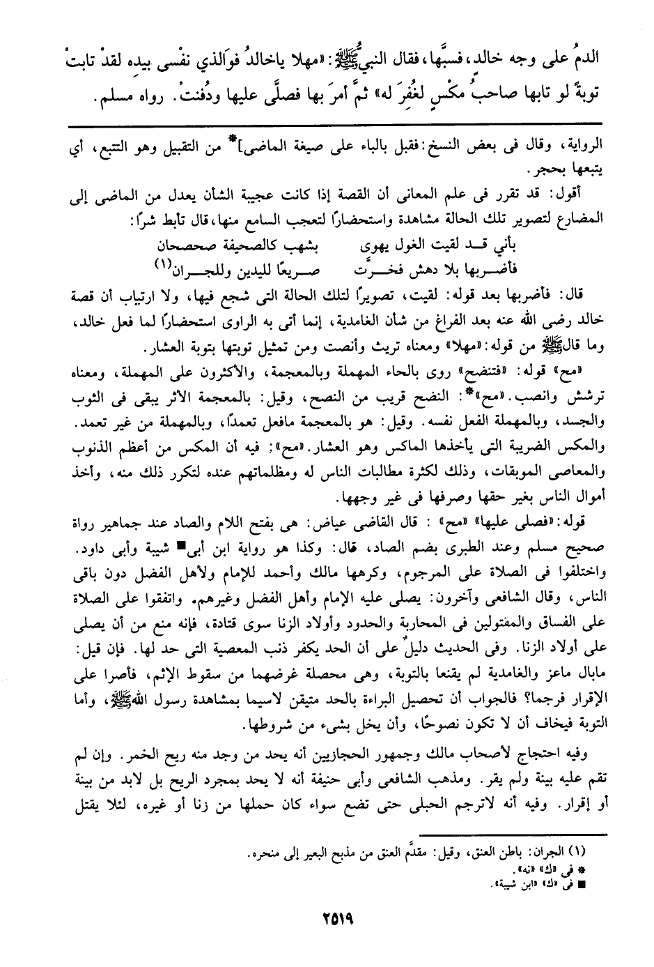 قال: فأضربها بعد قوله: لقيت، تصويراً لتلك الحالة التي شجع فيها، ولا ارتياب أن قصة خالد رضي الله عنه بعد الفراغ من شأن الغامدية، إنما أتى به الراوي استحضاراً لما فعل خالد، وما قال صلى الله عليه وسلم من قوله: ((مهلا)) ومعناه تريث وأنصت ومن تمثيل توبتها بتوبة العشار.